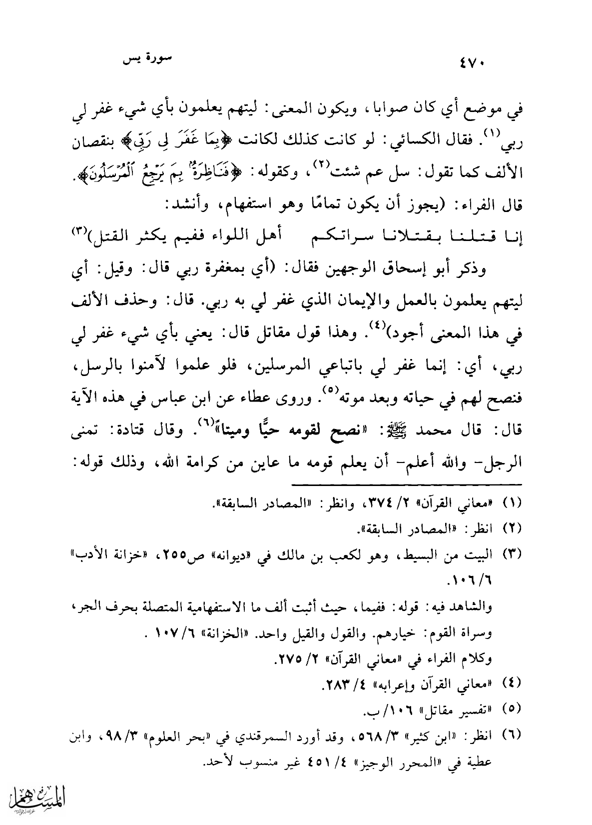 وذكر أبو إسحاق الوجهين فقال: (أي بمغفرة ربي قال: وقيل: أي ليتهم يعلمون بالعمل والإيمان الذي غفر لي به ربي. قال: وحذف الاَّلف في هذا المعنى أجود) (¬4). وهذا قول مقاتل قال: يعني بأي شيء غفر لي ربي، أي: إنما غفر لي باتباعي المرسلين، فلو علموا لآمنوا بالرسل، فنصح لهم في حياته وبعد موته (¬5). وروى عطاء عن ابن عباس في هذه الآية قال: قال محمد -صلى الله عليه وسلم-: "نصح لقومه حيًّا وميتًا" (¬6). وقال قتادة: تمنى الرجل -والله أعلم- أن يعلم قومه ما عاين من كرامة الله، وذلك قوله: