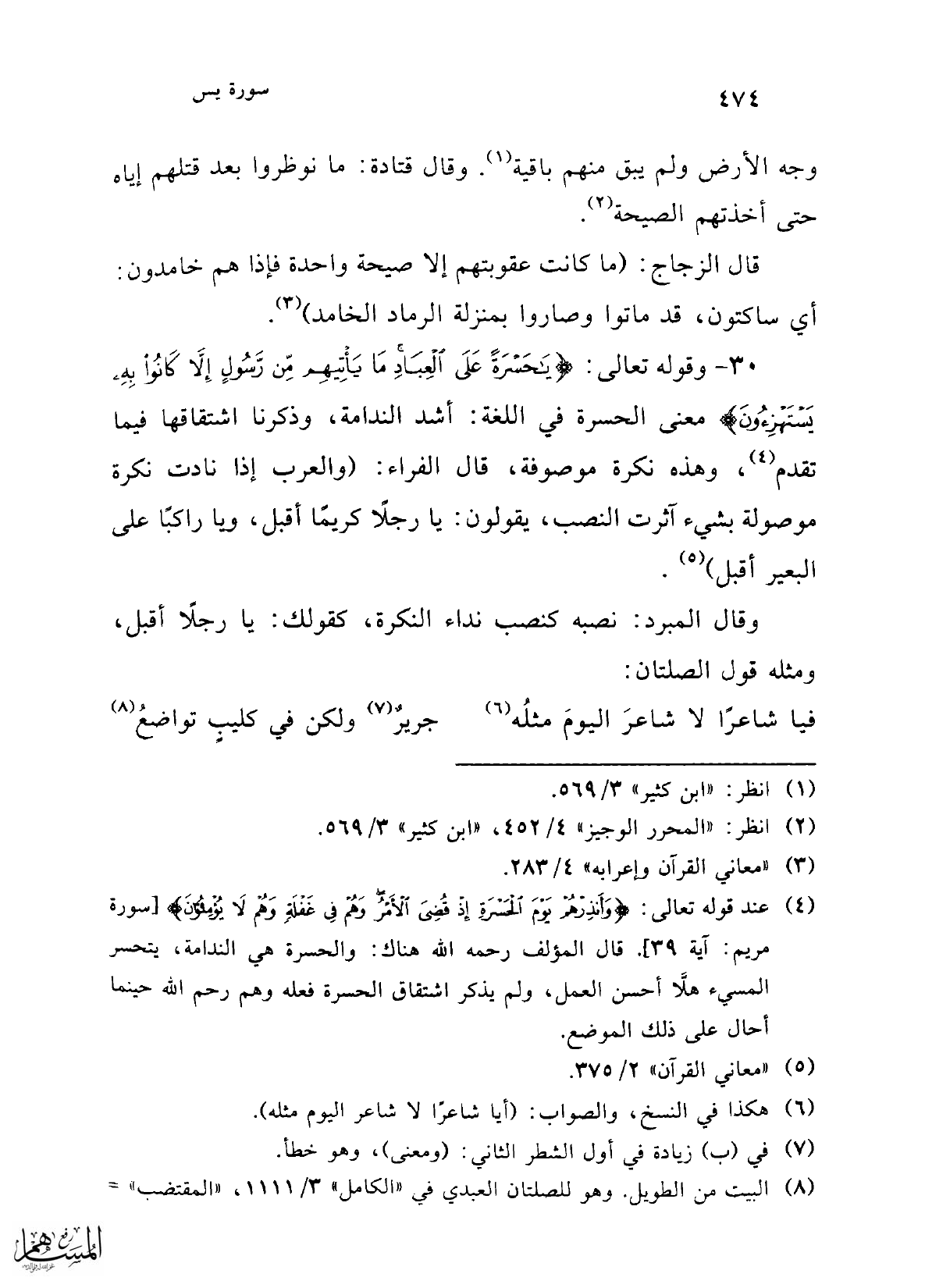 30 - وقوله تعالى: {يَا حَسْرَةً عَلَى الْعِبَادِ مَا يَأْتِيهِمْ مِنْ رَسُولٍ إِلَّا كَانُوا بِهِ يَسْتَهْزِئُونَ} معنى الحسرة في اللغة: أشد الندامة، وذكرنا اشتقاقها فيما تقدم (¬4)، وهذه نكرة موصوفة، قال الفراء: (والعرب إذا نادت نكرة موصولة بشيء آثرت النصب، يقولون: يا رجلاً كريمًا أقبل، ويا راكبًا على البعير أقبل) (¬5).