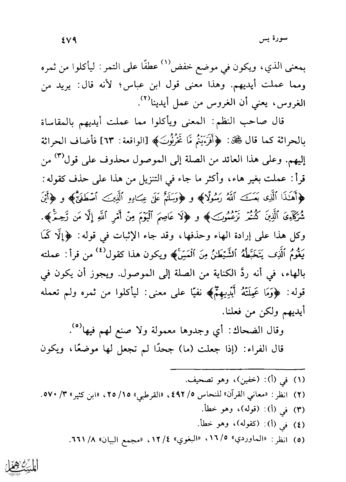 قال صاحب النظم: المعنى ويأكلوا بما عملت أيديهم بالمقاساة بالحراثة كما قال -عز وجل-: {أَفَرَأَيْتُمْ مَا تَحْرُثُونَ} [الواقعة: 63] فأضاف الحراثة إليهم. وعلى هذا العائد من الصلة إلى الموصول محذوف على قول (¬3) من قرأ: عملت بغير هاء، وأكثر ما جاء في التنزيل من هذا على حذف كقوله: {أَهَذَا الَّذِي بَعَثَ اللَّهُ رَسُولًا} و {وَسَلَامٌ عَلَى عِبَادِهِ الَّذِينَ اصْطَفَى} و {أَيْنَ شُرَكَائِيَ الَّذِينَ كُنْتُمْ تَزْعُمُونَ} و {لَا عَاصِمَ الْيَوْمَ مِنْ أَمْرِ اللَّهِ إِلَّا مَنْ رَحِمَ}. وكل هذا على إرادة الهاء وحذفها، وقد جاء الإثبات في قوله: {إِلَّا كَمَا يَقُومُ الَّذِي يَتَخَبَّطُهُ الشَّيْطَانُ مِنَ الْمَسِّ} ويكون هذا كقول (¬4) من قرأ: عملته بالهاء، في أنه ردَّ الكناية من الصلة إلى الموصول. ويجوز أن يكون في قوله: {وَمَا عَمِلَتْهُ أَيْدِيهِمْ} نفيًا على معنى: ليأكلوا من ثمره ولم تعمله أيديهم ولكن من فعلنا.
