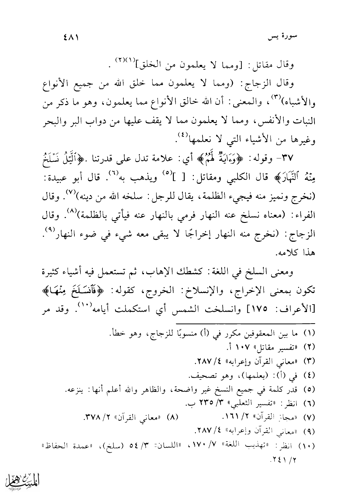 37 - وقوله: {وَآيَةٌ لَهُمُ} أي: علامة تدل على قدرتنا. {اللَّيْلُ نَسْلَخُ مِنْهُ النَّهَارَ} قال الكلبي ومقاتل: [..] (¬5) ويذهب به (¬6). قال أبو عبيدة: (نخرج ونميز منه فيجيء الظلمة، يقال للرجل: سلخه الله من دينه) (¬7). وقال الفراء: (معناه نسلخ عنه النهار فرمي بالنهار عنه فيأتي بالظلمة) (¬8). وقال الزجاج: (نخرج منه النهار إخراجًا لا يبقى معه شيء في ضوء النهار (¬9). هذا كلامه.