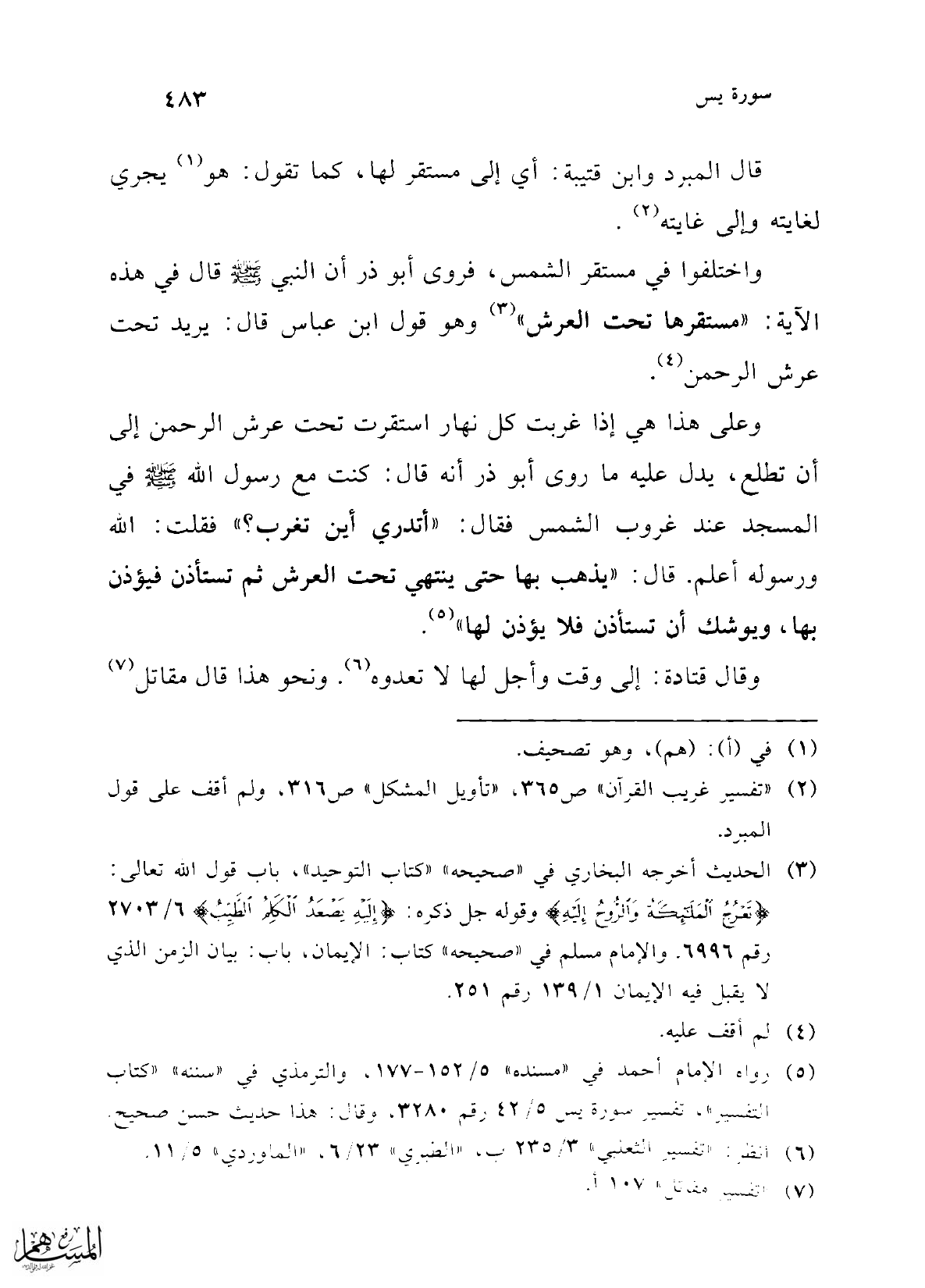 واختلفوا في مستقر الشمس، فروى أبو ذر أن النبي -صلى الله عليه وسلم- قال في هذه الآية: "مستقرها تحت العرش" (¬3) وهو قول ابن عباس قال: يريد تحت عرش الرحمن (¬4).