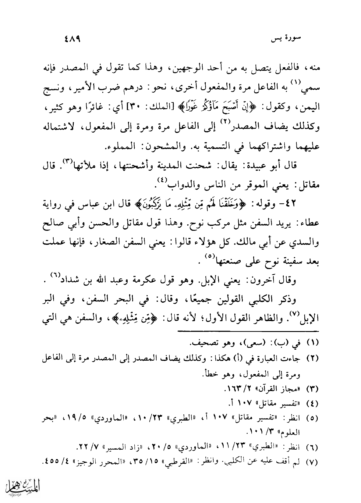 منه، فالفعل يتصل به من أحد الوجهين، وهذا كما تقول في المصدر فإنه سمي (¬1) به الفاعل مرة والمفعول أخرى، نحو: درهم ضرب الأمير، ونسج اليمن، وكقول {إِنْ أَصْبَحَ مَاؤُكُمْ غَوْرًا} [الملك: 30] أي: غائرًا وهو كثير، وكذلك يضاف المصدر (¬2) إلى الفاعل مرة ومرة إلى المفعول، لاشتماله عليهما واشتراكهما في التسمية به. والمشحون: المملوء.