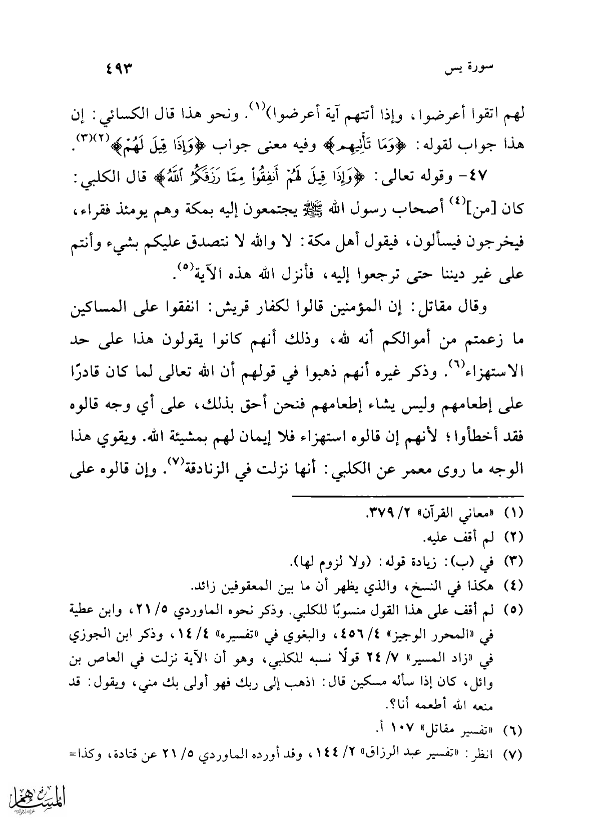 47 - وقوله تعالى: {وَإِذَا قِيلَ لَهُمْ أَنْفِقُوا مِمَّا رَزَقَكُمُ اللَّهُ} قال الكلبي: كان [من] (¬4) أصحاب رسول الله -صلى الله عليه وسلم- يجتمعون إليه بمكة وهم يومئذ فقراء، فيخرجون فيسألون، فيقول أهل مكة: لا والله لا نتصدق عليكم بشيء وأنتم على غير ديننا حتى ترجعوا إليه، فأنزل الله هذه الآية (¬5).