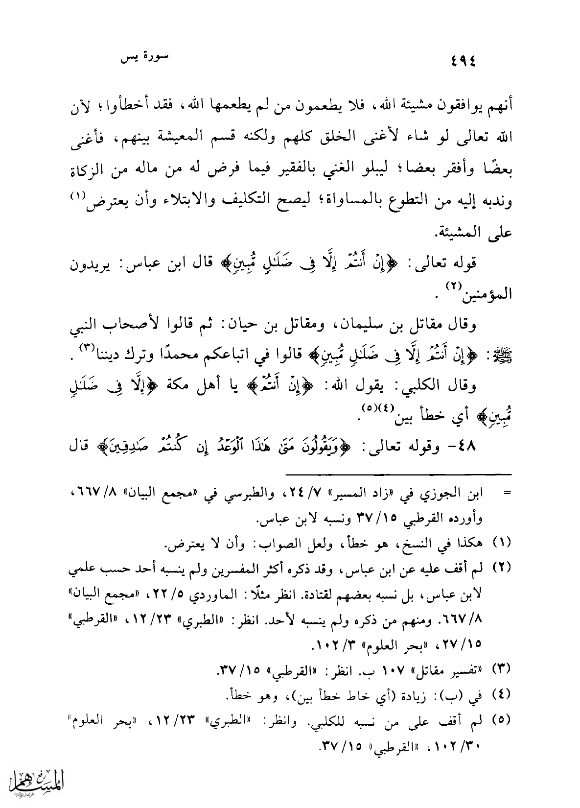 أنهم يوافقون مشيئة الله، فلا يطعمون من لم يطعمها الله، فقد أخطأوا؛ لأن الله تعالى لو شاء لأغنى الخلق كلهم ولكنه قسم المعيشة بينهم، فأغنى بعضًا وأفقر بعضا؛ ليبلو الغني بالفقير فيما فرض له من ماله من الزكاة وندبه إليه من التطوع بالمساواة؛ ليصح التكليف والابتلاء وأن يعترض (¬1) على المشيئة.