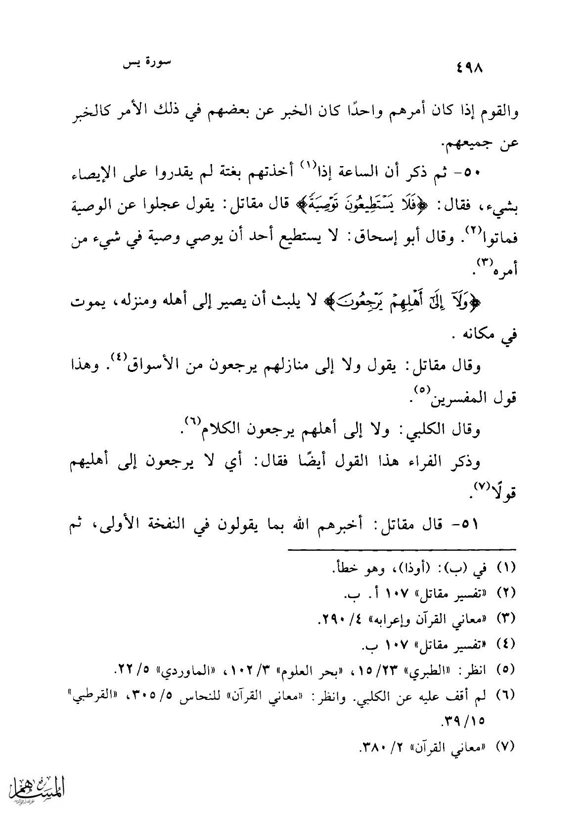 50 - ثم ذكر أن الساعة إذا (¬1) أخذتهم بغتة لم يقدروا على الإيصاء بشيء، فقال: {فَلَا يَسْتَطِيعُونَ تَوْصِيَةً} قال مقاتل: يقول عجلوا عن الوصية فماتوا (¬2). وقال أبو إسحاق: لا يستطيع أحد أن يوصي وصية في شيء من أمره (¬3).