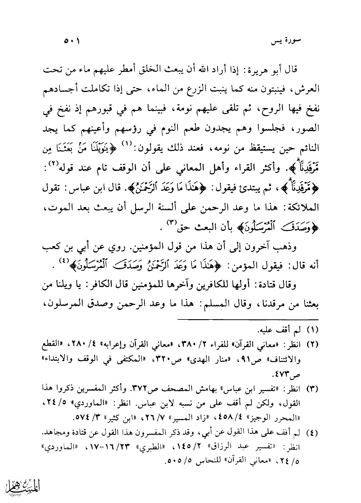 قال أبو هريرة: إذا أراد الله أن يبعث الخلق أمطر عليهم ماء من تحت العرش، فينبتون منه كما ينبت الزرع من الماء، حتى إذا تكاملت أجسادهم نفخ فيها الروح، ثم تلقى عليهم نومة، فبينما هم في قبورهم إذ نفخ في الصور، فجلسوا وهم يجدون طعم النوم في رؤسهم وأعينهم كما يجد النائم حين يستيقظ من نومه، فعند ذلك يقولون: (¬1) {يَا وَيْلَنَا مَنْ بَعَثَنَا مِنْ مَرْقَدِنَا}. وأكثر القراء وأهل المعاني على أن الوقف تام عند قوله (¬2): {مَرْقَدِنَا}، ثم يبتدئ فيقول: {هَذَا مَا وَعَدَ الرَّحْمَنُ}. قال ابن عباس: تقول الملائكة: هذا ما وعد الرحمن على ألسنة الرسل أن يبعث بعد الموت، {وَصَدَقَ الْمُرْسَلُونَ} بأن البعث حق (¬3).