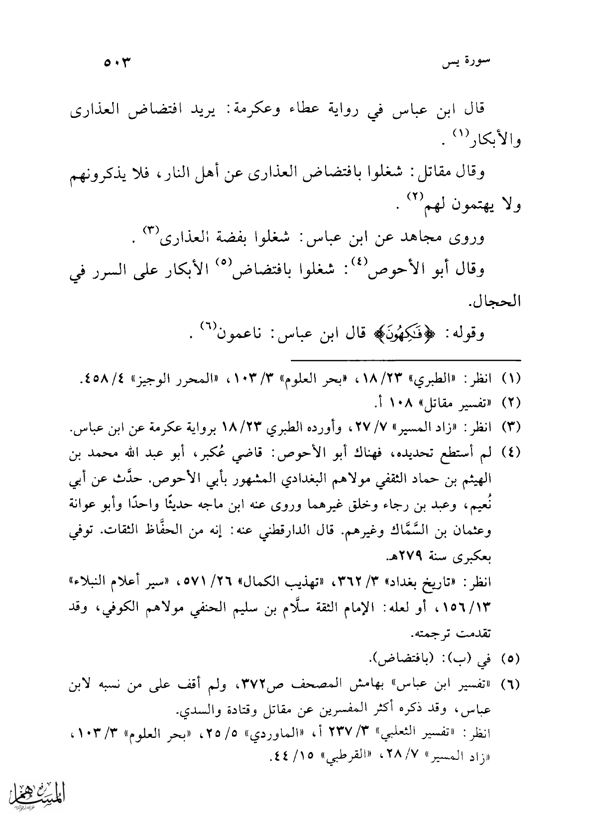 (¬6) "تفسير ابن عباس" بهامش المصحف ص 372، ولم أقف على من نسبه لابن عباس، وقد ذكره أكثر المفسرين عن مقاتل وقتادة والسدي.