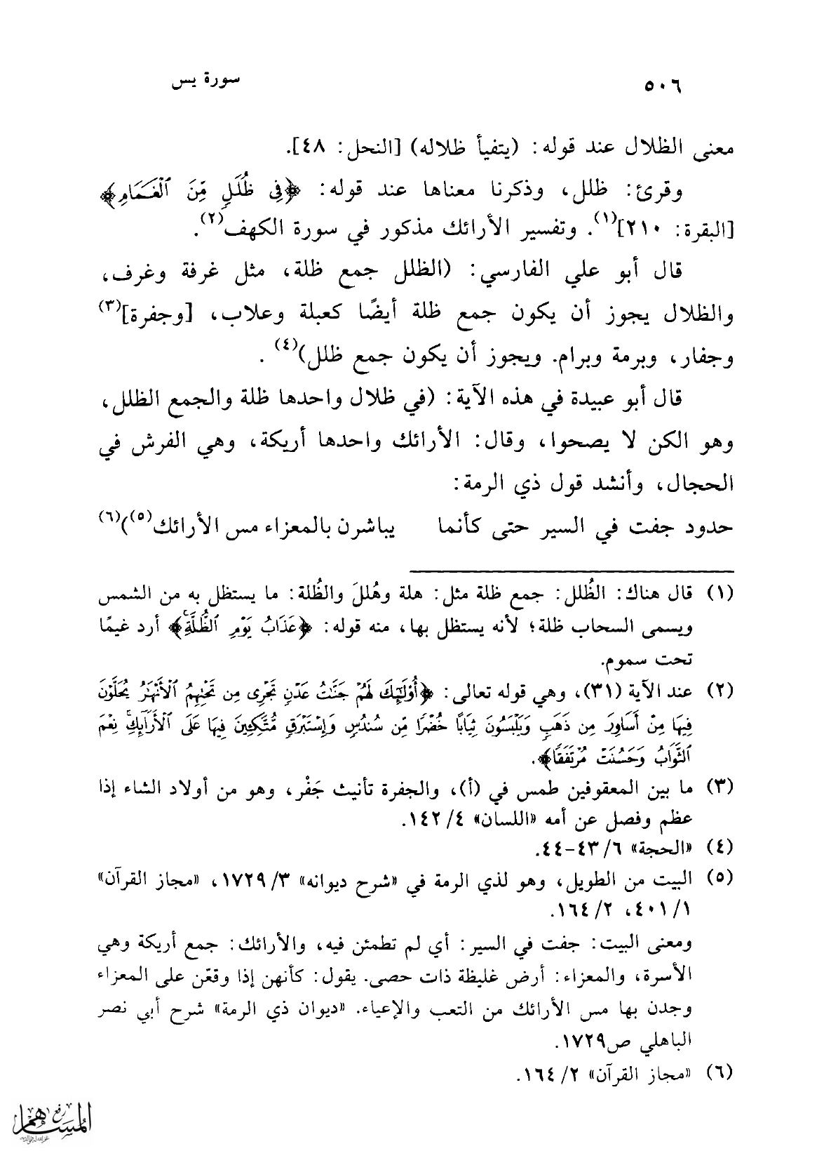 قال أبو عبيدة في هذه الآية: (في ظلال واحدها ظلة والجمع الظلل، وهو الكن لا يصحوا، وقال: الأرائك واحدها أريكة، وهي الفرش في الحجال، وأنشد قول ذي الرمة: