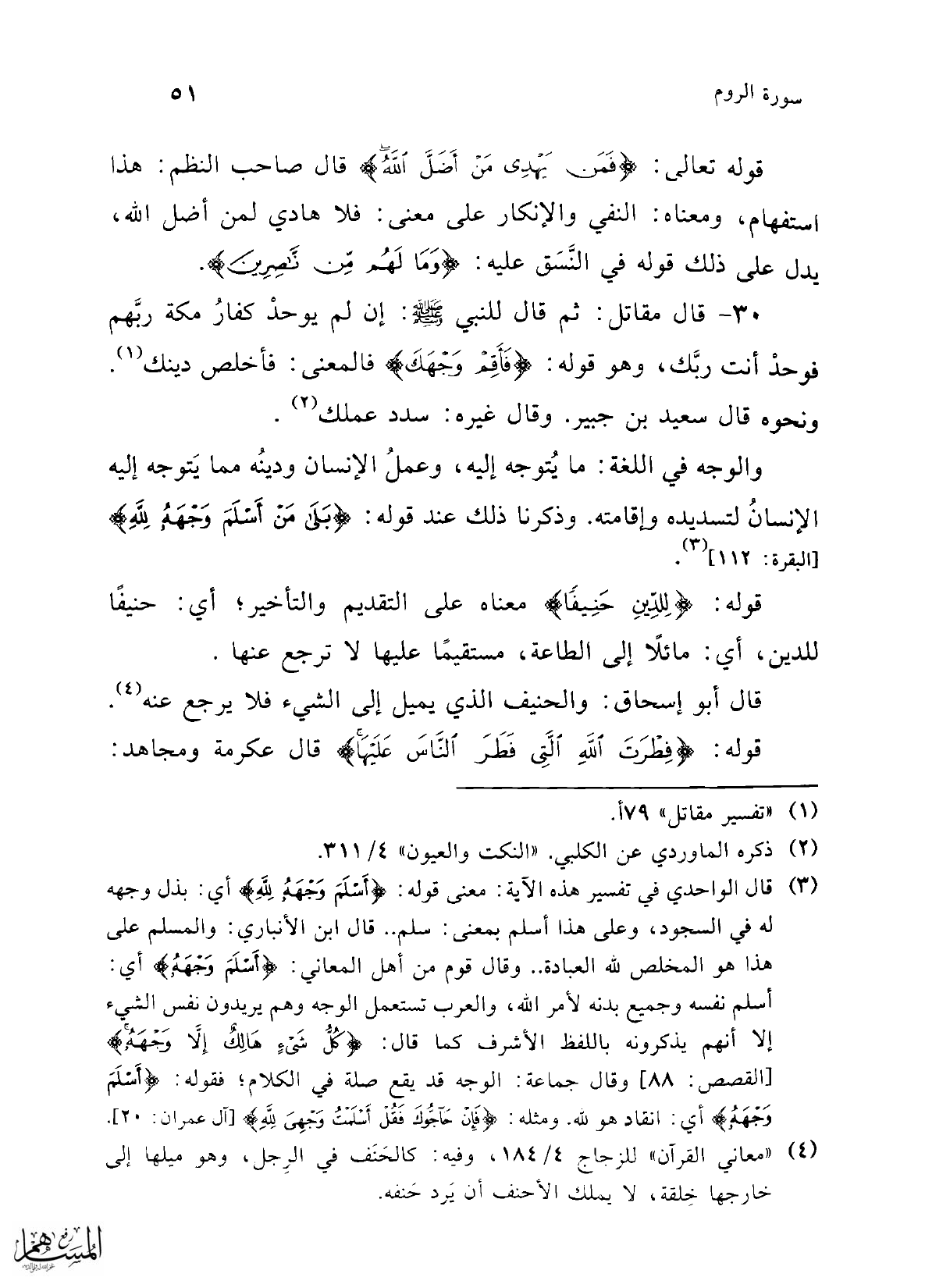(¬3) قال الواحدي في تفسير هذه الآية: معنى قوله: {أَسْلَمَ وَجْهَهُ لِلَّهِ} أي: بذل وجهه له في السجود، وعلى هذا أسلم بمعنى: سلم .. قال ابن الأنباري: والمسلم على هذا هو المخلص لله العبادة .. وقال قوم من أهل المعاني: {أَسْلَمَ وَجْهَهُ} أي: أسلم نفسه وجميع بدنه لأمر الله، والعرب تستعمل الوجه وهم يريدون نفس الشيء إلا أنهم يذكرونه باللفظ الأشرف كما قال: {كُلُّ شَيْءٍ هَالِكٌ إِلَّا وَجْهَهُ} [القصص: 88] وقال جماعة: الوجه قد يقع صلة في الكلام؛ فقوله: {أَسْلَمَ وَجْهَهُ} أي: انقاد هو لله. ومثله: {فَإِنْ حَاجُّوكَ فَقُلْ أَسْلَمْتُ وَجْهِيَ لِلَّهِ} [آل عمران: 20].
