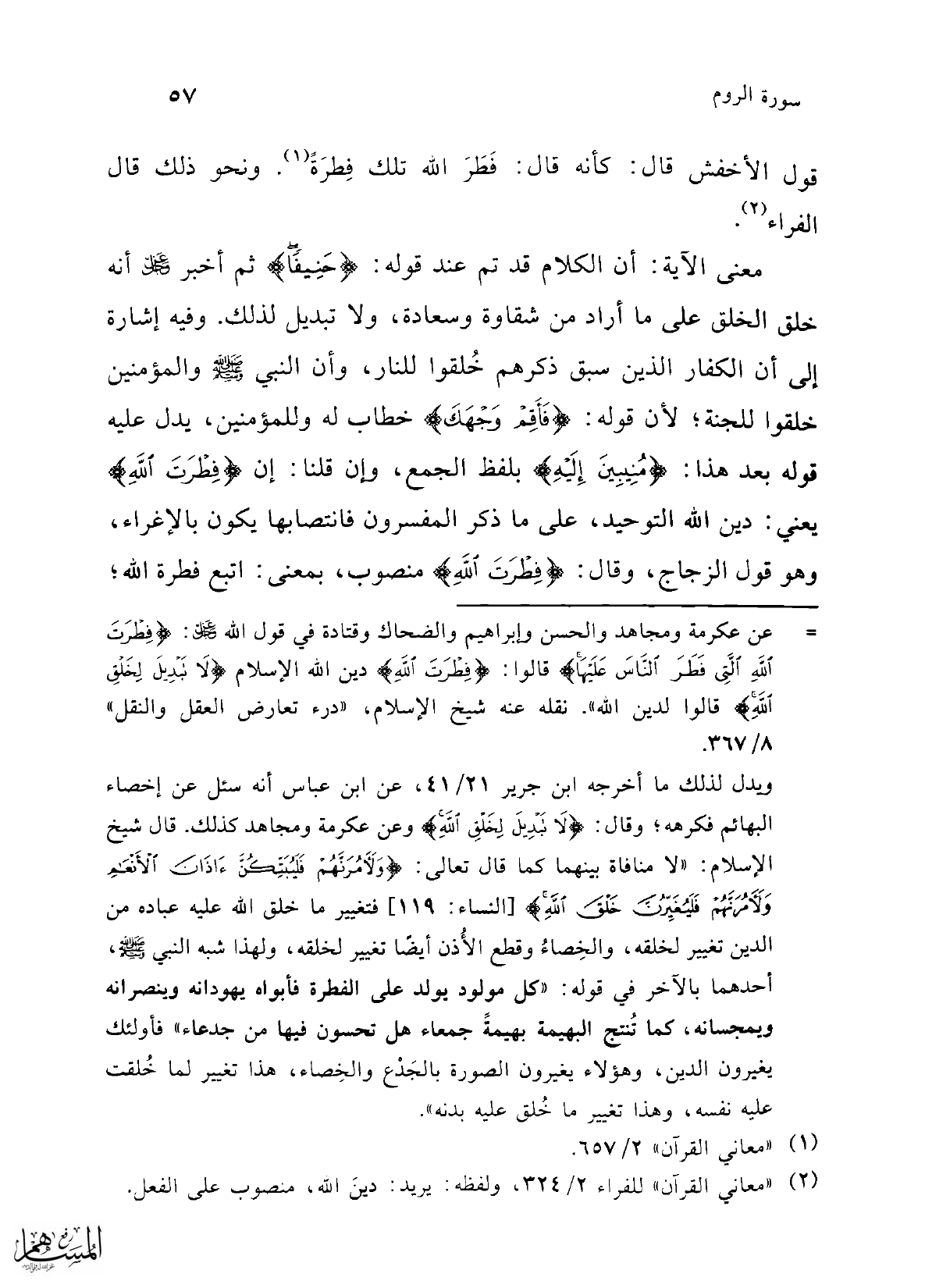 معنى الآية: أن الكلام قد تم عند قوله: {حَنِيفًا} ثم أخبر -عز وجل- أنه خلق الخلق على ما أراد من شقاوة وسعادة، ولا تبديل لذلك. وفيه إشارة إلى أن الكفار الذين سبق ذكرهم خُلقوا للنار، وأن النبي -صلى الله عليه وسلم- والمؤمنين خلقوا للجنة؛ لأن قوله: {فَأَقِمْ وَجْهَكَ} خطاب له وللمؤمنين، يدل عليه قوله بعد هذا: {مُنِيبِينَ إِلَيْهِ} بلفظ الجمع، وإن قلنا: إن {فِطْرَتَ اللَّهِ} يعني: دين الله التوحيد، على ما ذكر المفسرون فانتصابها يكون بالإغراء، وهو قول الزجاج، وقال: {فِطْرَتَ اللَّهِ} منصوب، بمعنى: اتبع فطرة الله؛