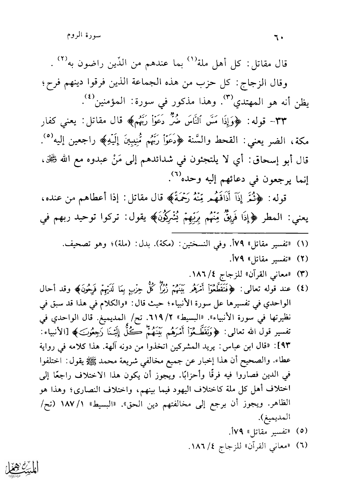 (¬4) عند قوله تعالى: {فَتَقَطَّعُوا أَمْرَهُمْ بَيْنَهُمْ زُبُرًا كُلُّ حِزْبٍ بِمَا لَدَيْهِمْ فَرِحُونَ} وقد أحال الواحدي في تفسيرها على سورة الأنبياء؛ حيث قال: "والكلام في هذا قد سبق في نظيرتها في سورة الأنبياء". "البسيط" 2/ 619. تح/ المديميغ. قال الواحدي في تفسير قول الله تعالى: {وَتَقَطَّعُوا أَمْرَهُمْ بَيْنَهُمْ كُلٌّ إِلَيْنَا رَاجِعُونَ} [الأنبياء: 93]: "قال ابن عباس: يريد المشركين اتخذوا من دونه آلهة. هذا كلامه في رواية عطاء. والصحيح أن هذا إخبار عن جميع مخالفي شريعة محمد -صلى الله عليه وسلم- يقول: اختلفوا في الدين فصاروا فيه فرقا وأحزابًا. ويجوز أن يكون هذا الاختلاف راجعًا إلى اختلاف أهل كل ملة كاختلاف اليهود فيما بينهم، واختلاف النصارى؛ وهذا هو الظاهر. ويجوز أن يرجع إلى مخالفتهم دين الحق". "البسيط" 1/ 187 (تح/ المديميغ).