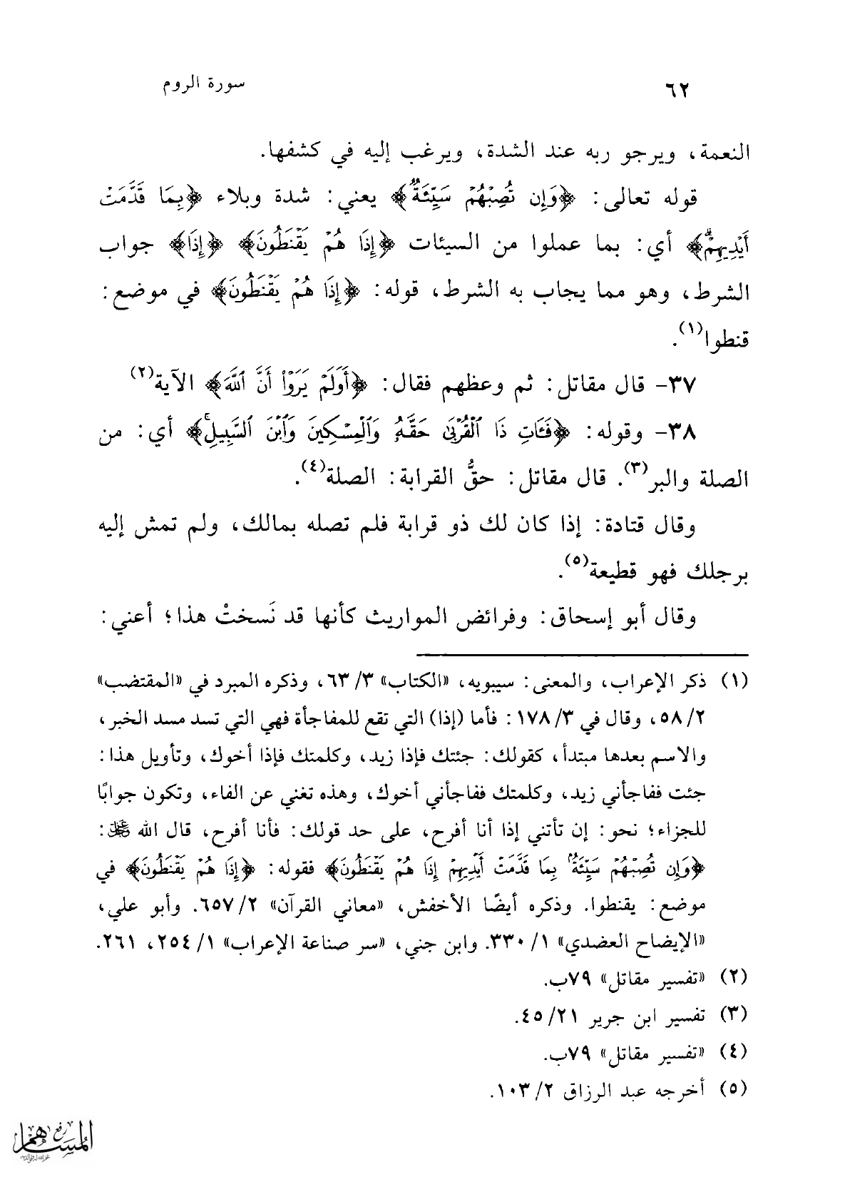 38 - وقوله: {فَآتِ ذَا الْقُرْبَى حَقَّهُ وَالْمِسْكِينَ وَابْنَ السَّبِيلِ} أي: من الصلة والبر (¬3). قال مقاتل: حقُّ القرابة: الصلة (¬4).
