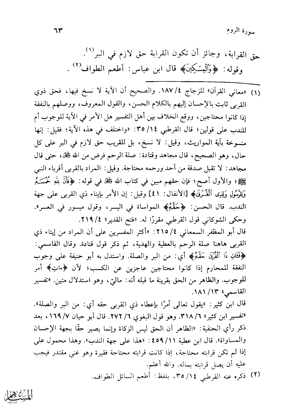 قال أبو المظفر السمعاني 4/ 215: "أكثر المفسرين على أن المراد من إيتاء ذي القربى هاهنا صلة الرحم بالعطية والهدية، ثم ذكر قول قتادة. وقال القاسمي: {فَآتِ ذَا الْقُرْبَى حَقَّهُ} أي: من البر والصلة. واستدل به أبو حنيفة على وجوب النفقة للمحارم إذا كانوا محتاجين عاجزين عن الكسب؛ لأن {ءاتِ} أمر للوجوب. والظاهر من الحق بقرينة ما قبله أنه: مالي، وهو استدلال متين. "تفسير القاسمي" 13/ 181.