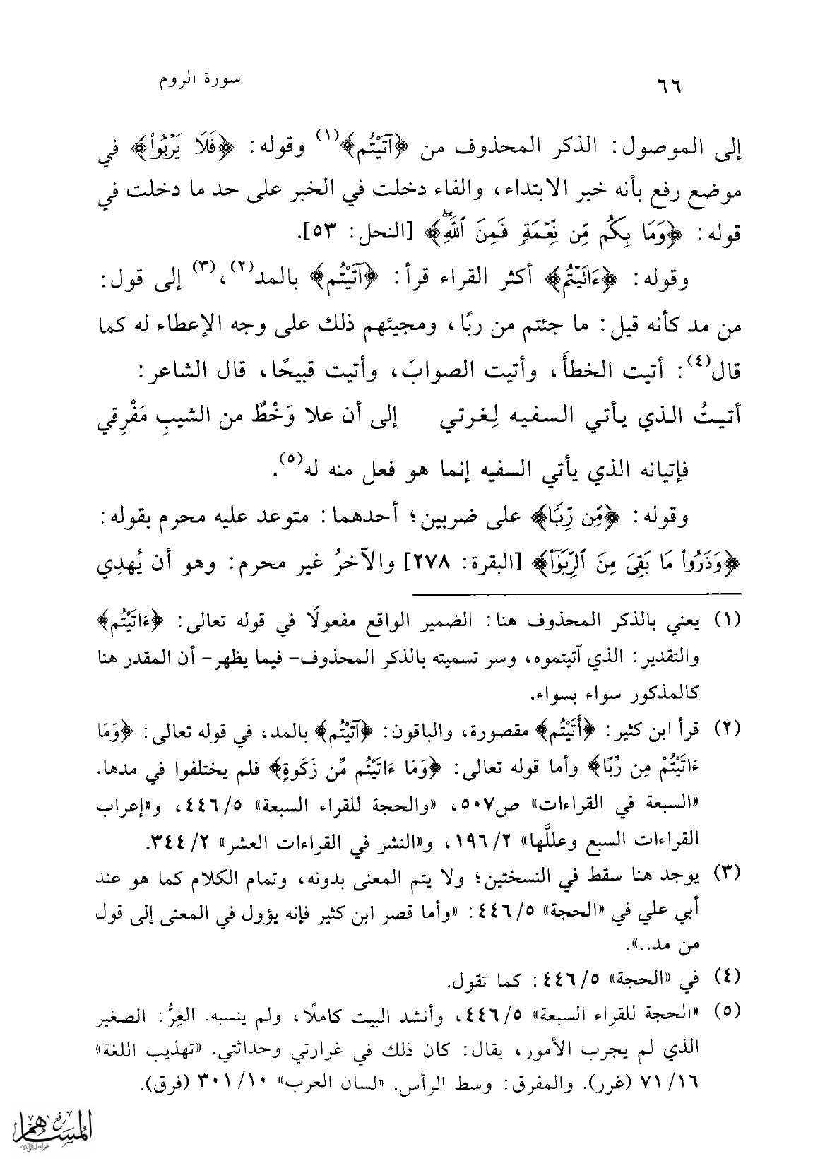 (¬2) قرأ ابن كثير: {أَتَيْتُمْ} مقصورة، والباقون: {آتَيْتُمْ} بالمد، في قوله تعالي: {وَمَا آتَيْتُمْ مِنْ رِبًا} وأما قوله تعالى: {وَمَا آتَيْتُمْ مِنْ زَكَاةٍ} فلم يختلفوا في مدها. "السبعة في القراءات" ص 507، "والحجة للقراء السبعة" 5/ 446، و"إعراب القراءات السبع وعللَّها" 2/ 196، و"النشر في القراءات العشر" 2/ 344.