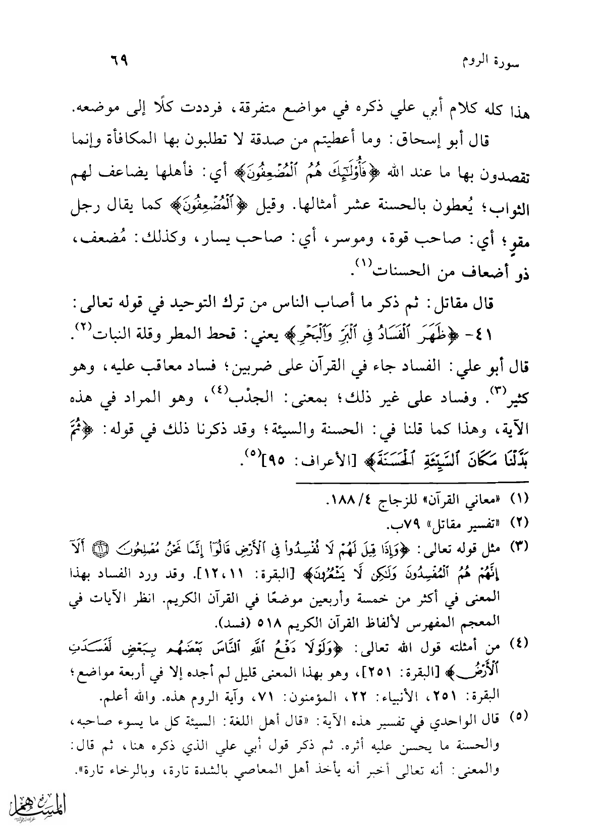 (¬3) مثل قوله تعالى: {وَإِذَا قِيلَ لَهُمْ لَا تُفْسِدُوا فِي الْأَرْضِ قَالُوا إِنَّمَا نَحْنُ مُصْلِحُونَ (11) أَلَا إِنَّهُمْ هُمُ الْمُفْسِدُونَ وَلَكِنْ لَا يَشْعُرُونَ} [البقرة: 11، 12]. وقد ورد الفساد بهذا المعنى في أكثر من خمسة وأربعين موضعًا في القرآن الكريم. انظر الآيات في المعجم المفهرس لألفاظ القرآن الكريم 518 (فسد).