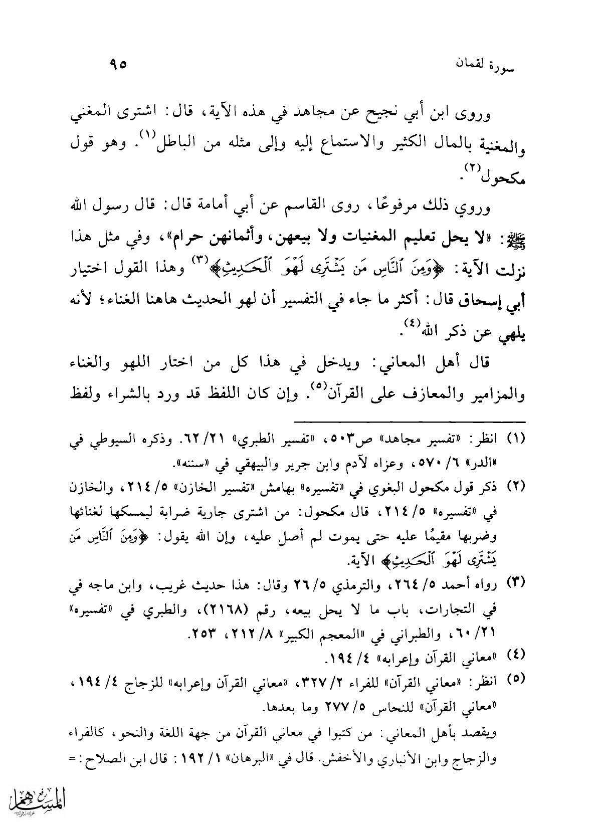 (¬2) ذكر قول مكحول البغوي في "تفسيره" بهامش "تفسير الخازن" 5/ 214، والخازن في "تفسيره" 5/ 214، قال مكحول: من اشترى جارية ضرابة ليمسكها لغنائها وضربها مقيمُا عليه حتى يموت لم أصل عليه، وإن الله يقول: {وَمِنَ النَّاسِ مَنْ يَشْتَرِي لَهْوَ الْحَدِيثِ} الآية.