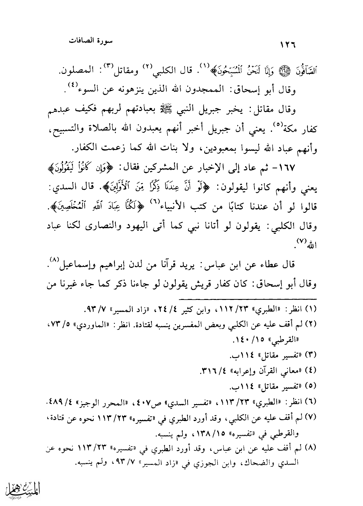 الصَّافُّونَ (165) وَإِنَّا لَنَحْنُ الْمُسَبِّحُونَ} (¬1). قال الكلبي (¬2) ومقاتل (¬3): المصلون.