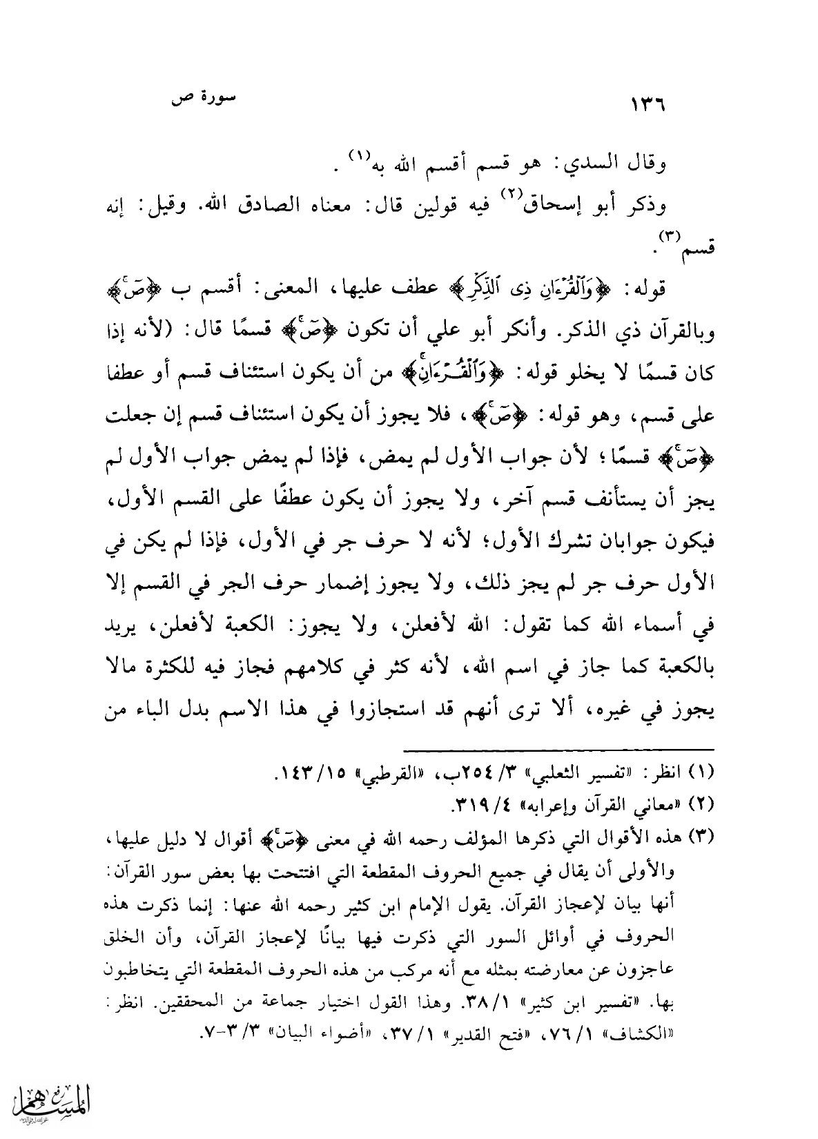 (¬3) هذه الأقوال التي ذكرها المؤلف رحمه الله في معنى {ص} أقوال لا دليل عليها، والأولى أن يقال في جميع الحروف المقطعة التي افتتحت بها بعض سور القرآن: أنها بيان لإعجاز القرآن. يقول الإمام ابن كثير رحمه الله عنها: إنما ذكرت هذه الحروف في أوائل السور التي ذكرت فيها بيانا لإعجاز القرآن، وأن الخلق عاجزون عن معارضته بمثله مع أنه مركب من هذه الحروف المقطعة التي يتخاطبون بها. "تفسير ابن كثير" 1/ 38. وهذا القول اختيار جماعة من المحققين. انظر. "الكشاف" 1/ 76، "فتح القدير" 1/ 37، "أضواء البيان" 3/ 3 - 7.