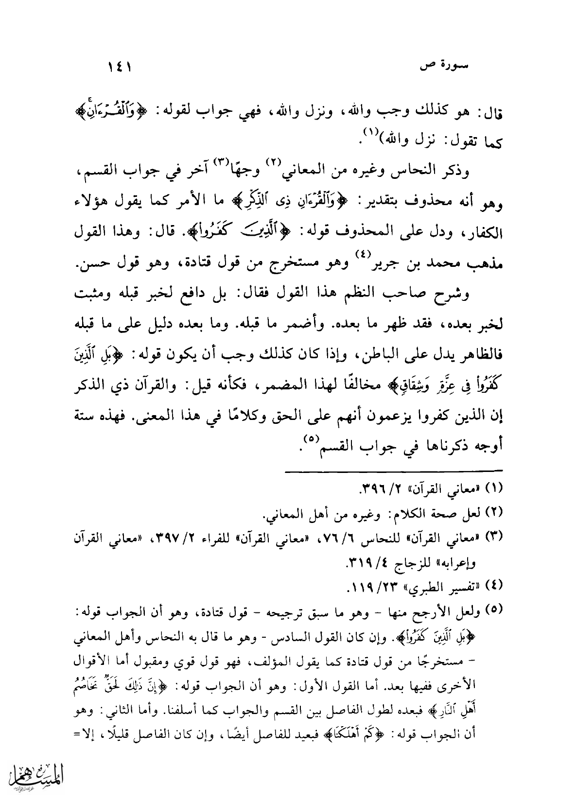 (¬5) ولعل الأرجح منها -وهو ما سبق ترجيحه- قول قتادة، وهو أن الجواب قوله: {بَلِ الَّذِينَ كَفَرُوا}. وإن كان القول السادس -وهو ما قال به النحاس وأهل المعاني- مستخرجاً من قول قتادة كما يقول المؤلف، فهو قول قوي ومقبول أما الأقوال الأخرى ففيها بعد. أما القول الأول: وهو أن الجواب قوله: {إِنَّ ذَلِكَ لَحَقٌّ تَخَاصُمُ أَهْلِ النَّارِ} فبعده لطول الفاصل بين القسم والجواب كما أسلفنا. وأما الثاني: وهو أن الجواب قوله: {كَمْ أَهْلَكْنَا} فبعيد للفاصل أيضًا، وإن كان الفاصل قليلاً، إلا =
