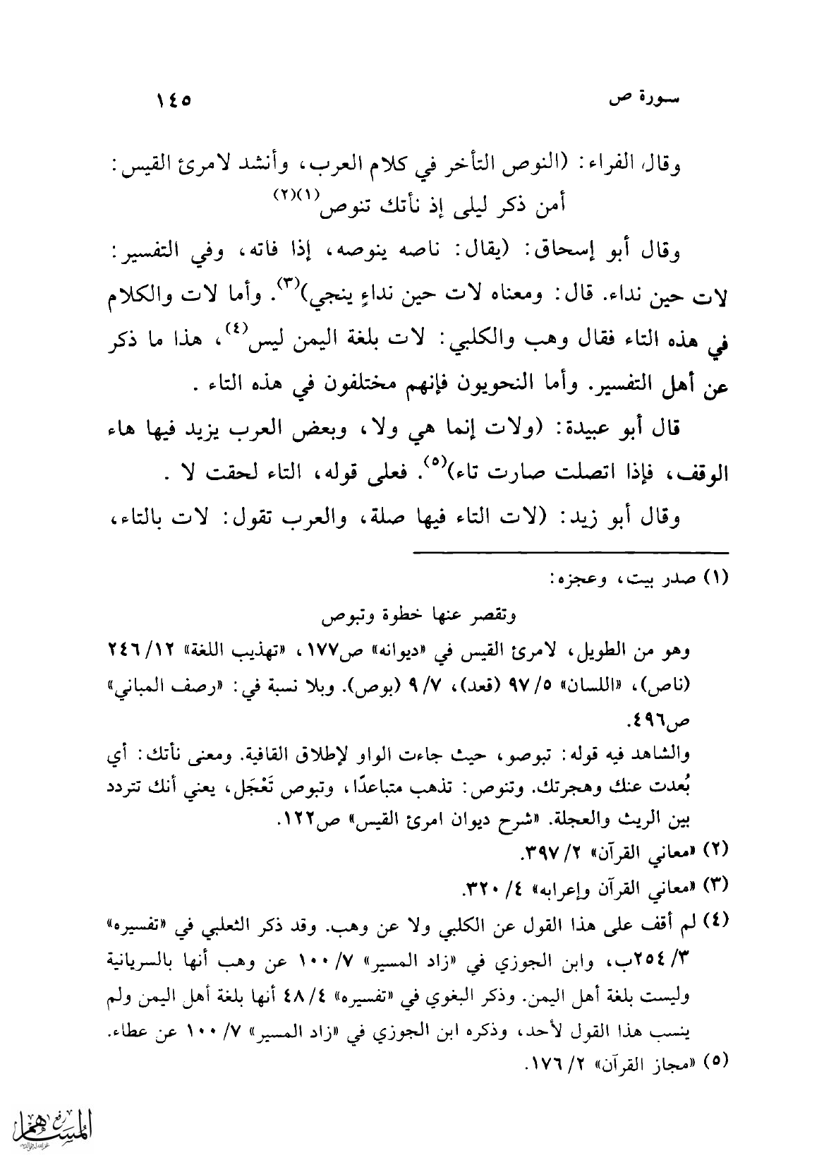 وقال أبو إسحاق: (يقال: ناصه ينوصه، إذا فاته، وفي التفسير: لات حين نداء. قال: ومعناه لات حين نداءٍ ينجي) (¬3). وأما لات والكلام في هذه التاء فقال وهب والكلبي: لات بلغة اليمن ليس (¬4)، هذا ما ذكر عن أهل التفسير. وأما النحويون فإنهم مختلفون في هذه التاء.