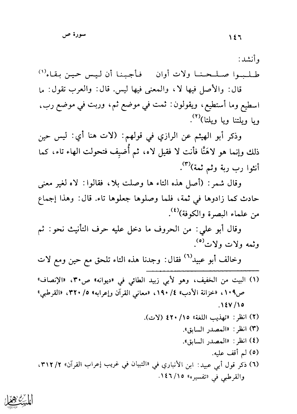 قال: والأصل فيها لا، والمعنى فيها ليس. قال: والعرب تقول: ما اسطيع وما أستطيع، ويقولون: ثمت في موضع ثم، وربت في موضع رب، ويا ويلتنا ويا ويلتا) (¬2).
