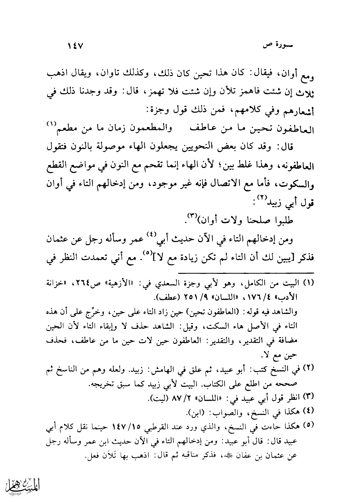 قال: وقد كان بعض النحويين يجعلون الهاء موصولة بالنون فتقول العاطفونه، وهذا غلط بين؛ لأن الهاء إنما تقحم مع النون في مواضح القطع والسكوت، فأما مع الاتصال فإنه غير موجود، ومن إدخالهم التاء في أوان قول أبي زبيد (¬2):