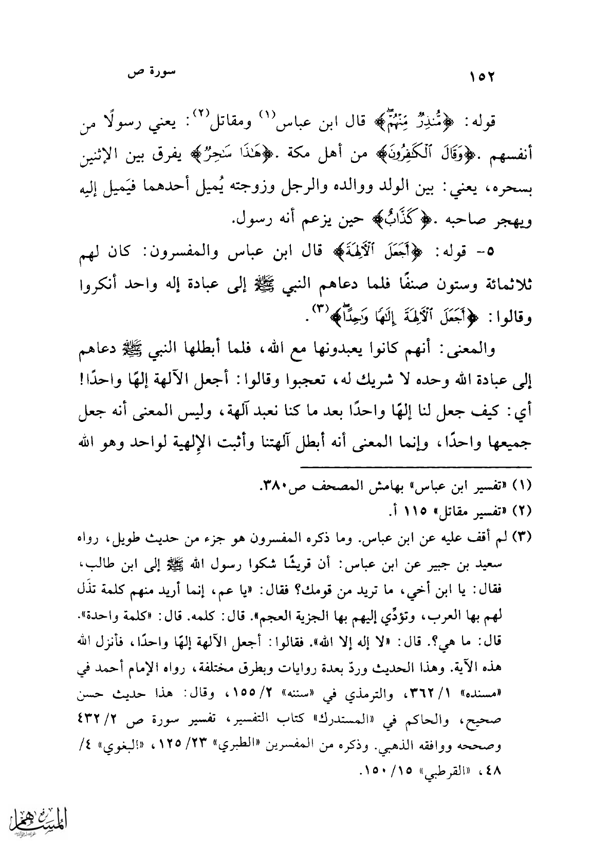 (¬3) لم أقف عليه عن ابن عباس. وما ذكره المفسرون هو جزء من حديث طويل، رواه سعيد بن جبير عن ابن عباس: أن قريشًا شكوا رسول الله -صلى الله عليه وسلم- إلى ابن طالب، فقال: يا ابن أخي، ما تريد من قومك؟ فقال: "يا عم، إنما أريد منهم كلمة تذَل لهم بها العرب، وتؤدِّي إليهم بها الجزية العجم". قال: كلمه. قال: "كلمة واحدة". قال: ما هي؟. قال: "لا إله إلا الله". فقالوا: أجعل الآلهة إلهاً واحدًا، فأنزل الله هذه الآية. وهذا الحديث وردّ بعدة روايات وبطرق مختلفة، رواه الإمام أحمد في "مسنده"1/ 362، والترمذي في "سننه" 2/ 155، وقال: هذا حديث حسن صحيح، والحاكم في "المستدرك" كتاب التفسير، تفسير سورة ص 2/ 432 وصححه ووافقه الذهبي. وذكره من المفسرين "الطبري" 23/ 125، "البغوي" 4/ 48، "القرطبي" 15/ 150.