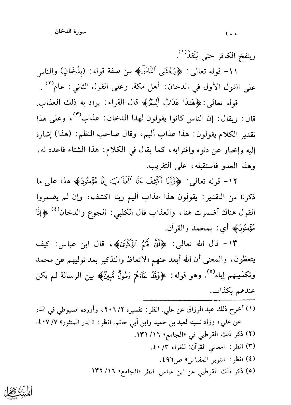 11 - قوله تعالى: {يَغْشَى النَّاسَ} من صفة قوله: (بِدُخَانٍ) والناس على القول الأول في الدخان: أهل مكة. وعلى القول الثاني: عام (¬2).
