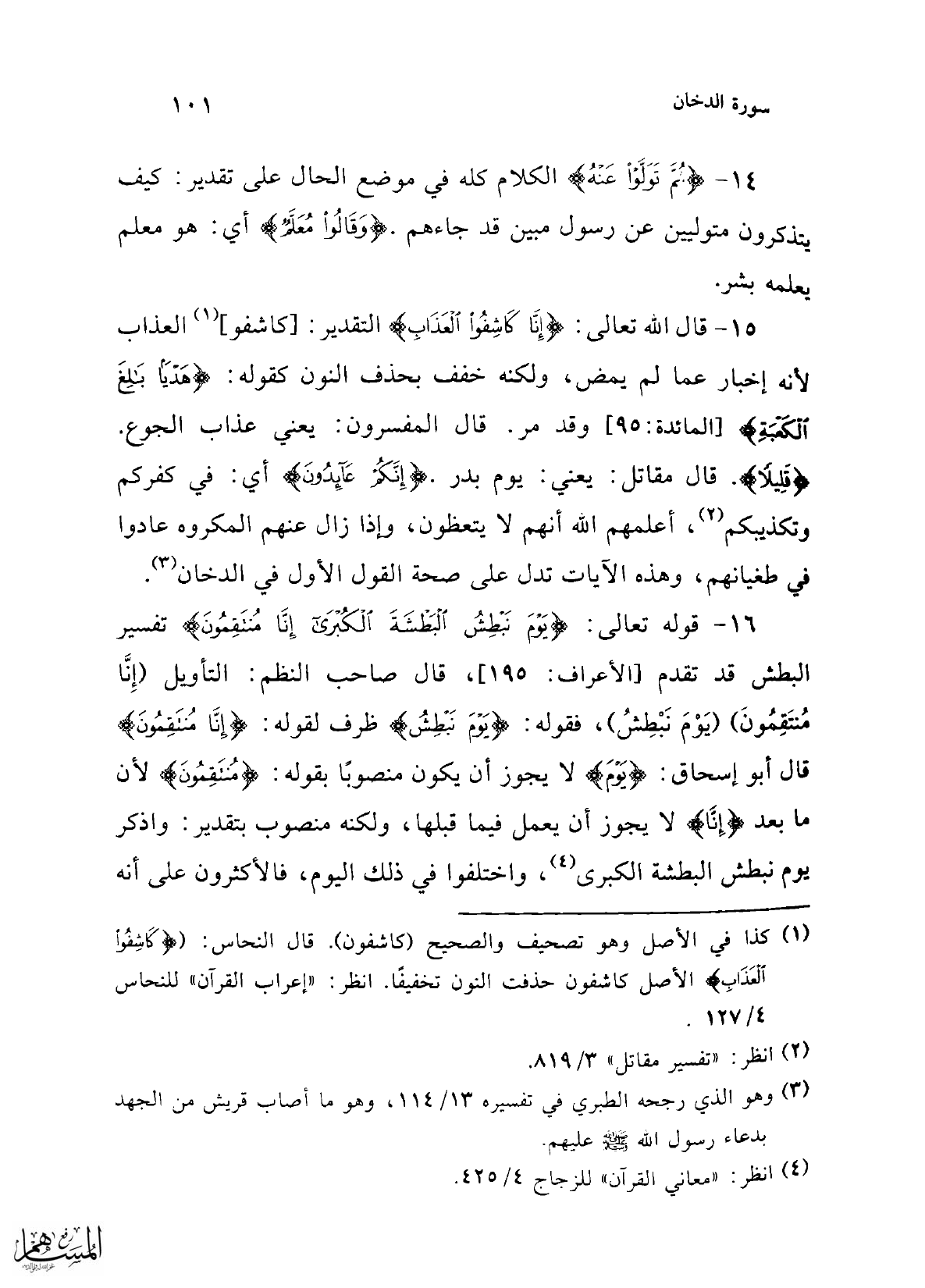 15 - قال الله تعالى: {إِنَّا كَاشِفُو الْعَذَابِ} التقدير: [كاشفو] (¬1) العذاب لأنه إخبار عما لم يمض، ولكنه خفف بحذف النون كقوله: {هَدْيًا بَالِغَ الْكَعْبَةِ} [المائدة: 95] وقد مر. قال المفسرون: يعني عذاب الجوع. {قَلِيلًا}. قال مقاتل: يعني: يوم بدر. {إِنَّكُمْ عَائِدُونَ} أي: في كفركم وتكذيبكم (¬2)، أعلمهم الله أنهم لا يتعظون، وإذا زال عنهم المكروه عادوا في طغيانهم، وهذه الآيات تدل على صحة القول الأول في الدخان (¬3).