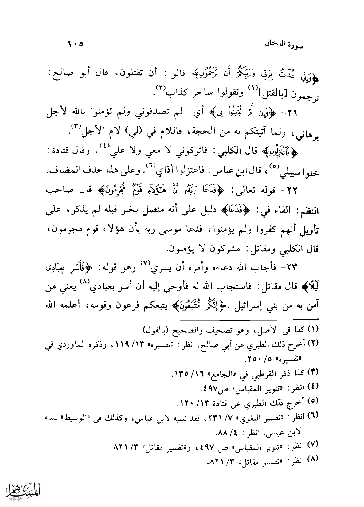 23 - فأجاب الله دعاءه وأمره أن يسري (¬7) وهو قوله: {فَأَسْرِ بِعِبَادِي لَيْلًا} قال مقاتل: فاستجاب الله له فأوحى إليه أن أسر بعبادي (¬8) يعني من آمن به من بني إسرائيل. {إِنَّكُمْ مُتَّبَعُونَ} يتبعكم فرعون وقومه، أعلمه الله