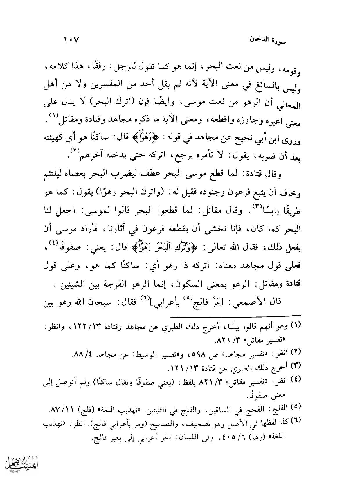 وقومه، وليس من نعت البحر، إنما هو كما تقول للرجل: رفقًا، هذا كلامه، وليس بالسائغ في معنى الآية لأنه لم يقل أحد من المفسرين ولا من أهل المعاني أن الرهو من نعت موسى، وأيضًا فإن (اترك البحر) لا يدل على معنى اعبره وجاوزه واقطعه، ومعنى الآية ما ذكره مجاهد وقتادة ومقاتل (¬1). وروى ابن أبي نجيح عن مجاهد في قوله: {رَهْوًا} قال: ساكنًا هو أي كهيئته بعد أن ضربه، يقول: لا تأمره يرجع، اتركه حتى يدخله آخرهم (¬2).