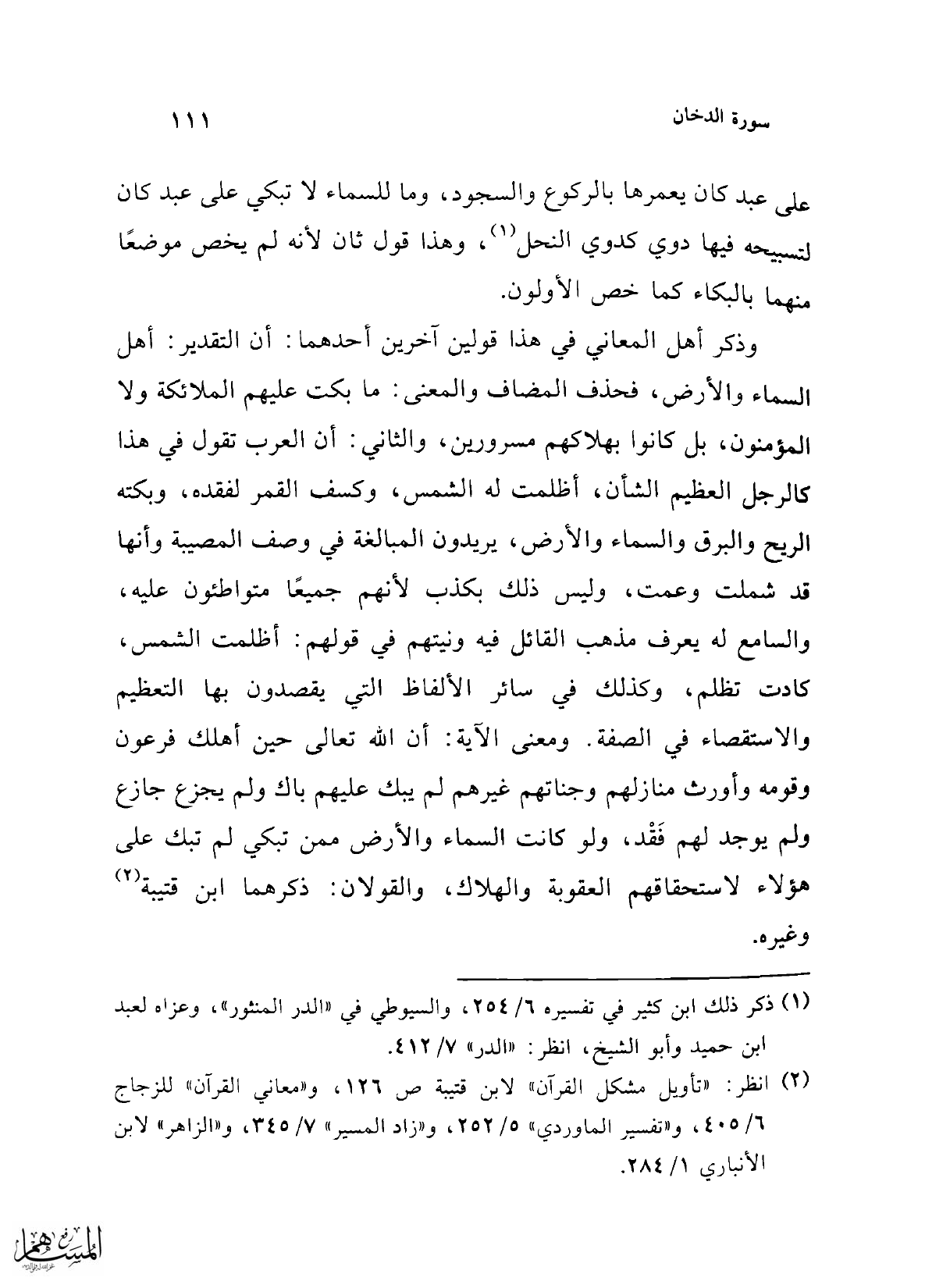 وذكر أهل المعاني في هذا قولين آخرين أحدهما: أن التقدير: أهل السماء والأرض، فحذف المضاف والمعنى: ما بكت عليهم الملائكة ولا المؤمنون، بل كانوا بهلاكهم مسرورين، والثاني: أن العرب تقول في هذا كالرجل العظيم الشأن، أظلمت له الشمس، وكسف القمر لفقده، وبكته الريح والبرق والسماء والأرض، يريدون المبالغة في وصف المصيبة وأنها قد شملت وعمت، وليس ذلك بكذب لأنهم جميعًا متواطئون عليه، والسامع له يعرف مذهب القائل فيه ونيتهم في قولهم: أظلمت الشمس، كادت تظلم، وكذلك في سائر الألفاظ التي يقصدون بها التعظيم والاستقصاء في الصفة. ومعنى الآية: أن الله تعالى حين أهلك فرعون وقومه وأورث منازلهم وجناتهم غيرهم لم يبك عليهم باك ولم يجزع جازع ولم يوجد لهم فَقْد، ولو كانت السماء والأرض ممن تبكي لم تبك على هؤلاء لاستحقاقهم العقوبة والهلاك، والقولان: ذكرهما ابن قتيبة (¬2) وغيره.