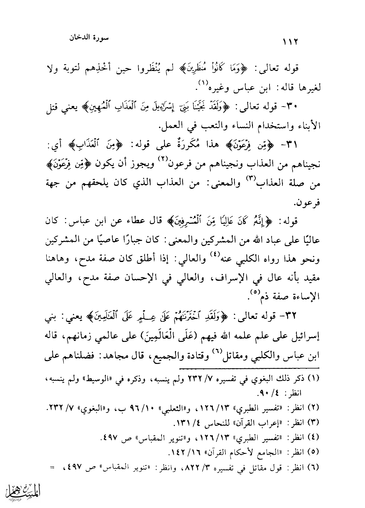 31 - {مِنْ فِرْعَوْنَ} هذا مُكَررَةٌ على قوله: {مِنَ الْعَذَابِ} أي: نجيناهم من العذاب ونجيناهم من فرعون (¬2) ويجوز أن يكون {مِنْ فِرْعَوْنَ} من صلة العذاب (¬3) والمعنى: من العذاب الذي كان يلحقهم من جهة فرعون.