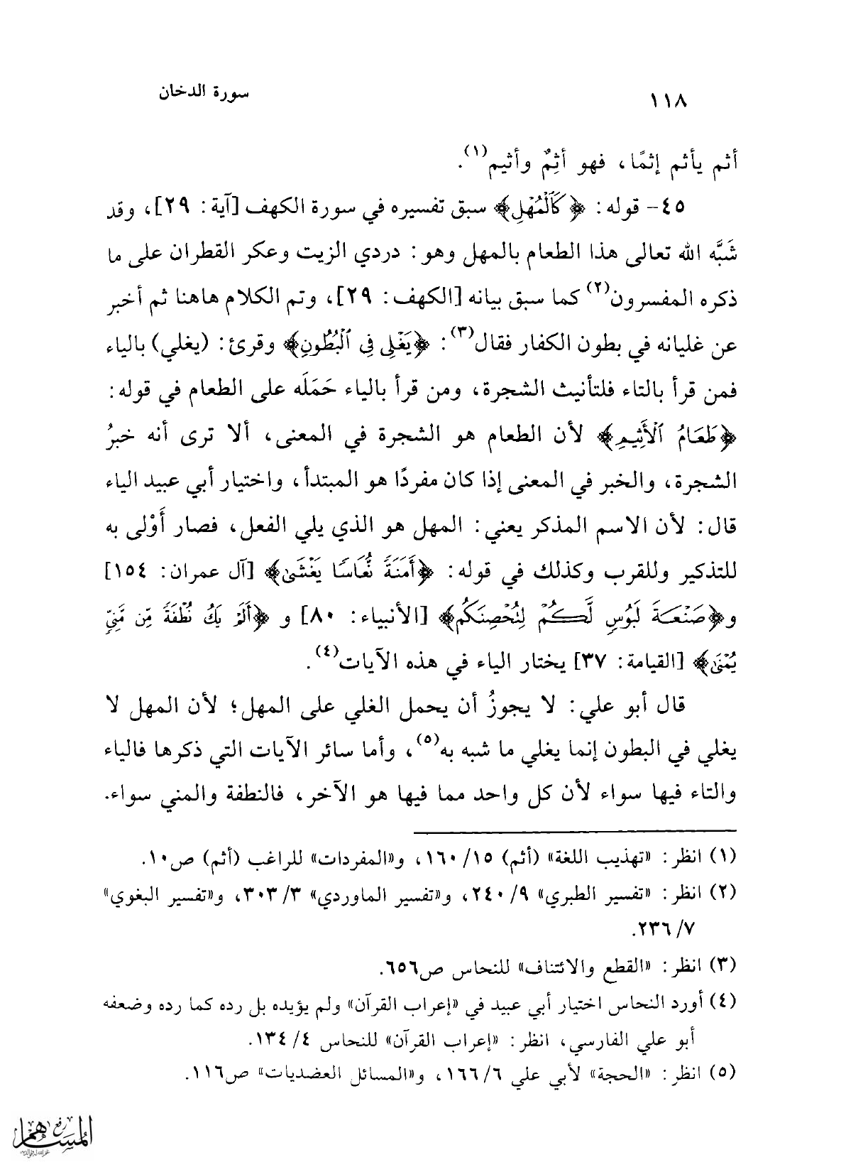 45 - قوله: {كَالْمُهْلِ} سبق تفسيره في سورة الكهف [آية: 29]، وقد شَبَّه الله تعالى هذا الطعام بالمهل وهو: دردي الزيت وعكر القطران على ما ذكره المفسرون (¬2) كما سبق بيانه [الكهف: 29]، وتم الكلام هاهنا ثم أخبر عن غليانه في بطون الكفار فقال (¬3): {يَغْلِي فِي الْبُطُونِ} وقرئ: (يغلي) بالياء فمن قرأ بالتاء فلتأنيث الشجرة، ومن قرأ بالياء حَمَلَه على الطعام في قوله: {طَعَامُ الْأَثِيمِ} لأن الطعام هو الشجرة في المعنى، ألا ترى أنه خبرُ الشجرة، والخبر في المعنى إذا كان مفردًا هو المبتدأ، واختيار أبي عبيد الياء قال: لأن الاسم المذكر يعني: المهل هو الذي يلي الفعل، فصار أَوْلى به للتذكير وللقرب وكذلك في قوله: {أَمَنَةً نُعَاسًا يَغْشَى} [آل عمران: 154] و {صَنْعَةَ لَبُوسٍ لَكُمْ لِتُحْصِنَكُمْ} [الأنبياء: 80] و {أَلَمْ يَكُ نُطْفَةً مِنْ مَنِيٍّ يُمْنَى} [القيامة: 37] يختار الياء في هذه الآيات (¬4).