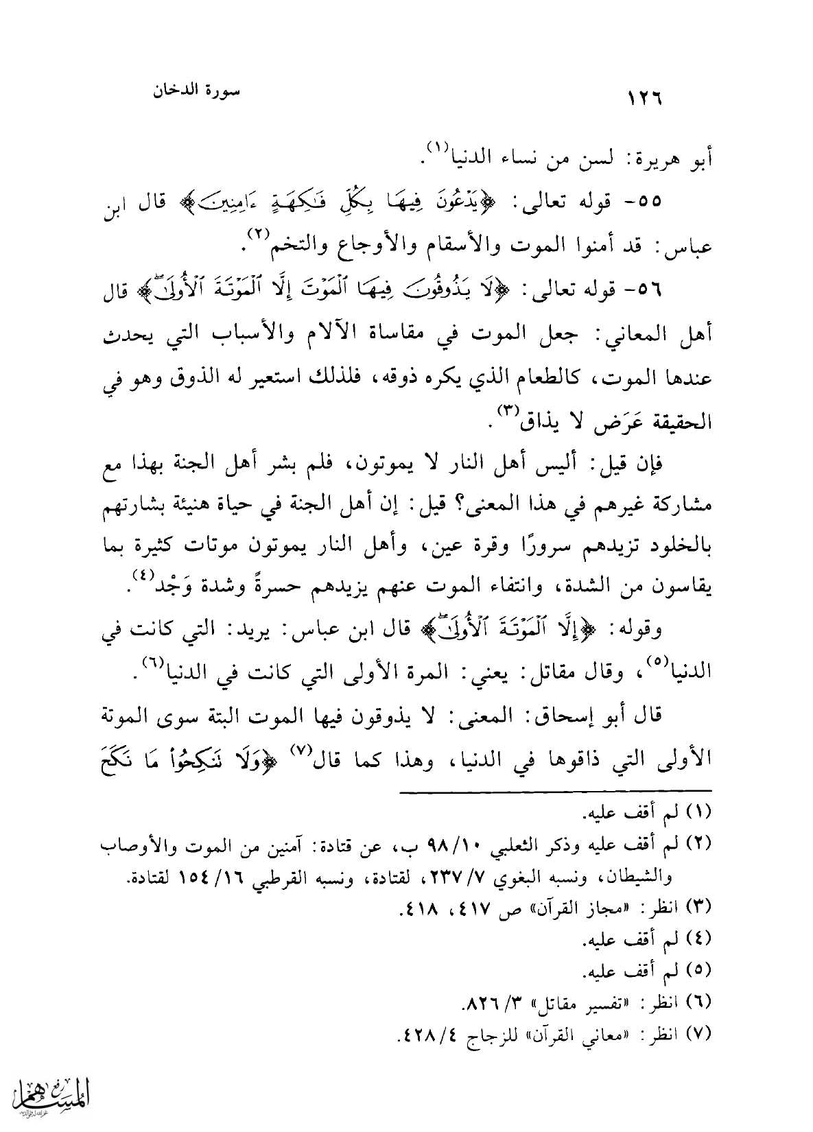 56 - قوله تعالى: {لَا يَذُوقُونَ فِيهَا الْمَوْتَ إِلَّا الْمَوْتَةَ الْأُولَى} قال أهل المعاني: جعل الموت في مقاساة الآلام والأسباب التي يحدث عندها الموت، كالطعام الذي يكره ذوقه، فلذلك استعير له الذوق وهو في الحقيقة عَرَض لا يذاق (¬3).
