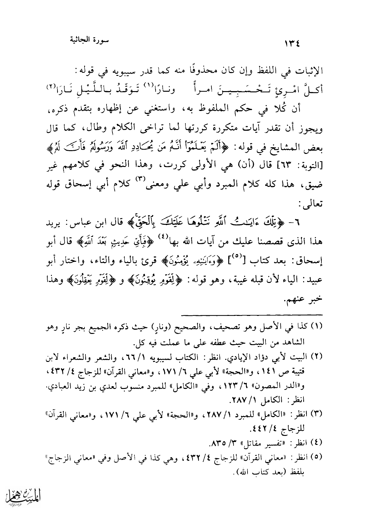 (¬3) انظر: "الكامل" للمبرد 1/ 287، و"الحجة" لأبي علي 6/ 171، و"معاني القرآن" للزجاج 4/ 442.