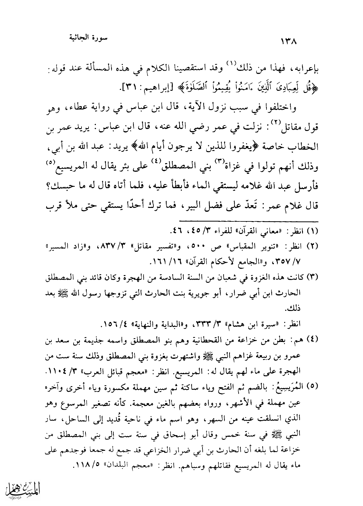 واختلفوا في سبب نزول الآية، قال ابن عباس في رواية عطاء، وهو قول مقاتل (¬2): نزلت في عمر رضي الله عنه، قال ابن عباس: يريد عمر بن الخطاب خاصة {يَغْفِرُوا لِلَّذِينَ لَا يَرْجُونَ أَيَّامَ اللَّهِ} يريد: عبد الله بن أبي، وذلك أنهم تولوا في غزاة (¬3) بني المصطلق (¬4) على بئر يقال له المريسيع (¬5) فأرسل عبد الله غلامه ليستقي الماء فأبطأ عليه، فلما أتاه قال له ما حبسك؟ قال غلام عمر: تَعدّ على فضل البير، فما ترك أحدًا يستقي حتى ملأ قرب
