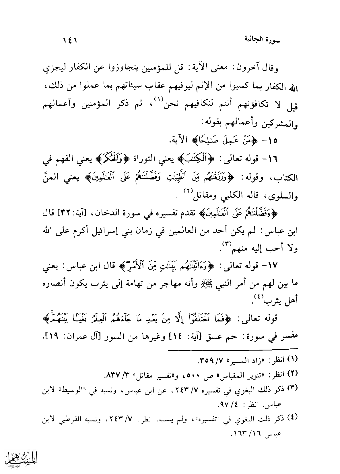 16 - قوله تعالى: {الْكِتَابَ} يعني التوراة {وَالْحُكْمَ} يعني الفهم في الكتاب، وقوله: {وَرَزَقْنَاهُمْ مِنَ الطَّيِّبَاتِ وَفَضَّلْنَاهُمْ عَلَى الْعَالَمِينَ} يعني المنَّ والسلوى، قاله الكلبي ومقاتل (¬2).