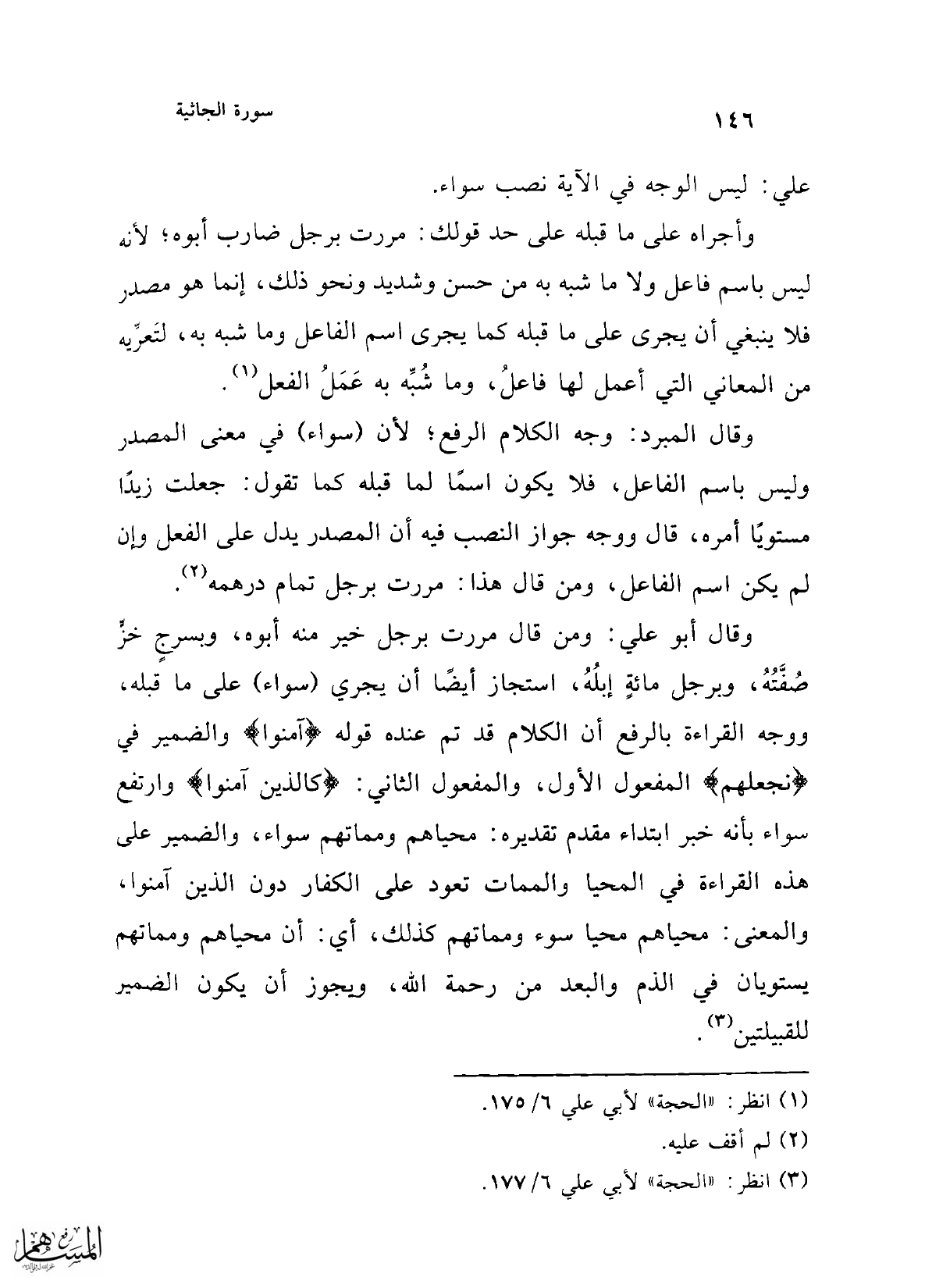 وقال أبو علي: ومن قال مررت برجل خير منه أبوه، وبسرجٍ خزٍّ صُفَّتُهُ، وبرجل مائةٍ إبلُهُ، استجاز أيضًا أن يجري (سواء) على ما قبله، ووجه القراءة بالرفع أن الكلام قد تم عنده قوله {آمنوا} والضمير في {نجعلهم} المفعول الأول، والمفعول الثاني: {كالذين آمنوا} وارتفع سواء بأنه خبر ابتداء مقدم تقديره: محياهم ومماتهم سواء، والضمير على هذه القراءة في المحيا والممات تعود على الكفار دون الذين آمنوا، والمعنى: محياهم محيا سوء ومماتهم كذلك، أي: أن محياهم ومماتهم يستويان في الذم والبعد من رحمة الله، ويجوز أن يكون الضيم للقبيلتين (¬3).