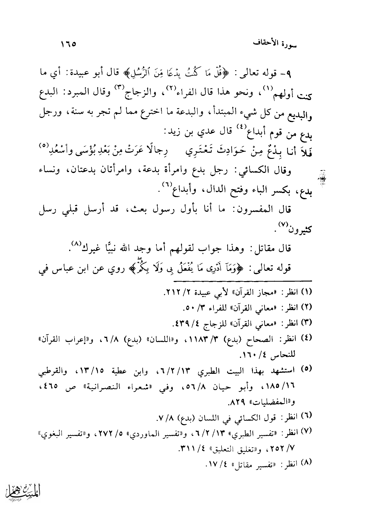 9 - قوله تعالى: {قُلْ مَا كُنْتُ بِدْعًا مِنَ الرُّسُلِ} قال أبو عبيدة: أي ما كنت أولهم (¬1)، ونحو هذا قال الفراء (¬2)، والزجاج (¬3) وقال المبرد: البدع والبديع من كل شيء المبتدأ، والبدعة ما اخترع مما لم تجر به سنة، ورجل درع من قوم أبداع (¬4) قال عدي بن زيد: