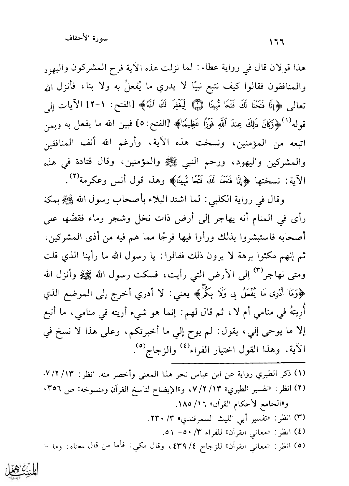 هذا قولان قال في رواية عطاء: لما نزلت هذه الآية فرح المشركون واليهود والمنافقون فقالوا كيف نتبع نبيًا لا يدري ما يُفعلُ به ولا بنا، فأنزل الله تعالى {إِنَّا فَتَحْنَا لَكَ فَتْحًا مُبِينًا (1) لِيَغْفِرَ لَكَ اللَّهُ} [الفتح: 1 - 2] الآيات إلى قوله (1) {وَكَانَ ذَلِكَ عِنْدَ اللَّهِ فَوْزًا عَظِيمًا} [الفتح: 5] فبين الله ما يفعل به وبمن اتبعه من المؤمنين، ونسخت هذه الآية، وأرغم الله أنف المنافقين والمشركين واليهود، ورحم النبي -صلى الله عليه وسلم- والمؤمنين، وقال قتادة في هذه الآية: نسختها {إِنَّا فَتَحْنَا لَكَ فَتْحًا مُبِينًا} وهذا قول أنس وعكرمة (2).