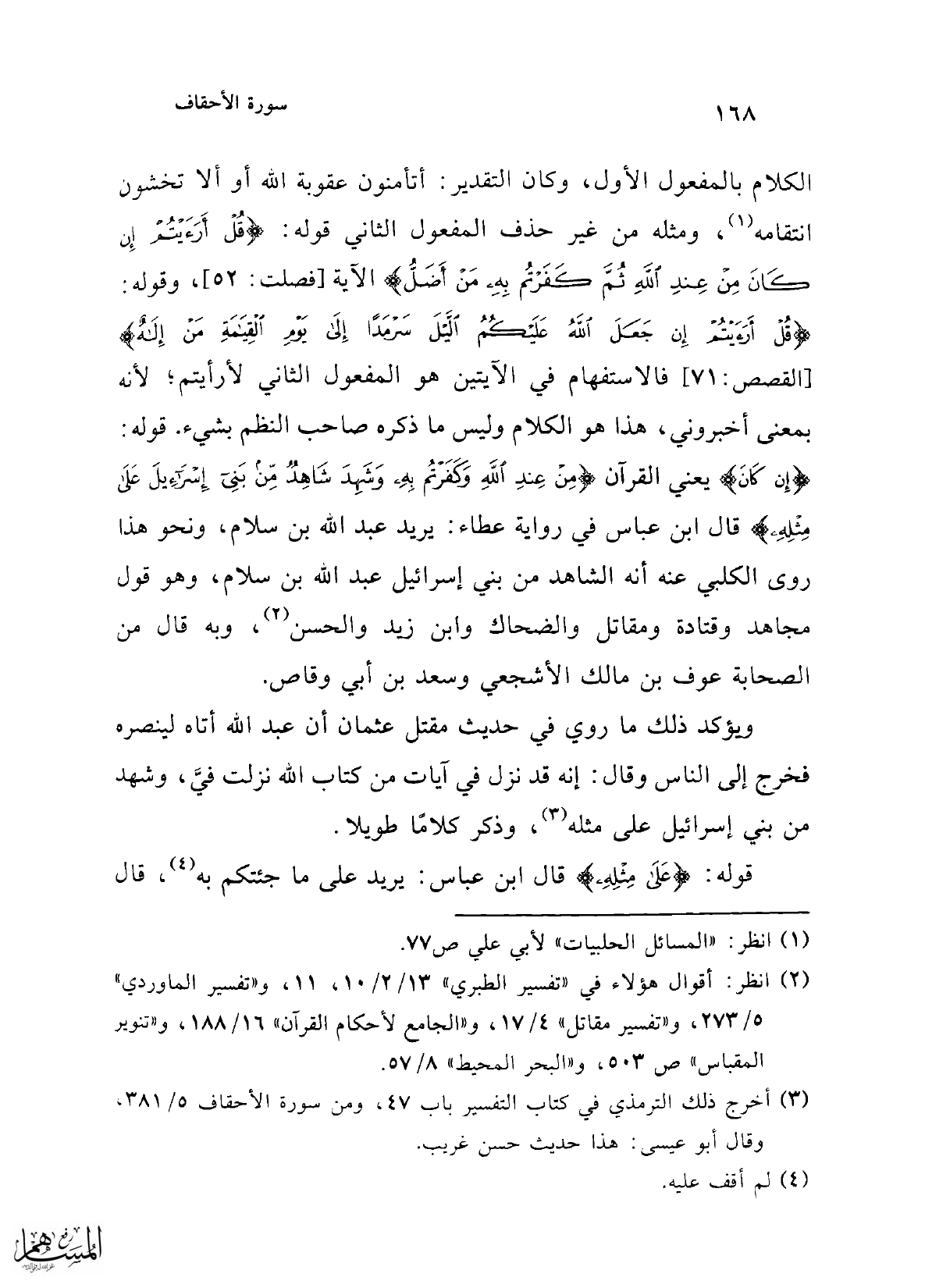 الكلام بالمفعول الأول، وكان التقدير: أتأمنون عقوبة الله أو ألا تخشون انتقامه (¬1)، ومثله من غير حذف المفعول الثاني قوله: {قُلْ أَرَأَيْتُمْ إِنْ كَانَ مِنْ عِنْدِ اللَّهِ ثُمَّ كَفَرْتُمْ بِهِ مَنْ أَضَلُّ} [فصلت: 52]، وقوله. {قُلْ أَرَأَيْتُمْ إِنْ جَعَلَ اللَّهُ عَلَيْكُمُ اللَّيْلَ سَرْمَدًا إِلَى يَوْمِ الْقِيَامَةِ مَنْ إِلَهٌ} [القصص: 71] فالاستفهام في الآيتين هو المفعول الثاني لأرأيتم؛ لأنه بمعنى أخبروني، هذا هو الكلام وليس ما ذكره صاحب النظم بشيء. قوله: {إِنْ كَانَ} يعني القرآن {مِنْ عِنْدِ اللَّهِ وَكَفَرْتُمْ بِهِ وَشَهِدَ شَاهِدٌ مِنْ بَنِي إِسْرَائِيلَ عَلَى مِثْلِهِ} وقال ابن عباس في رواية عطاء: يريد عبد الله بن سلام، ونحو هذا روى الكلبي عنه أنه الشاهد من بني إسرائيل عبد الله بن سلام، وهو قول مجاهد وقتادة ومقاتل والضحاك وابن زيد والحسن (¬2)، وبه قال من الصحابة عوف بن مالك الأشجعي وسعد بن أبي وقاص.
