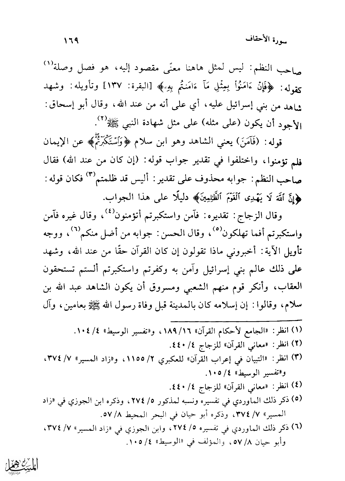 قوله: (فَآمَنَ) يعني الشاهد وهو ابن سلام {وَاسْتَكْبَرْتُمْ} عن الإيمان فلم تؤمنوا، واختلفوا في تقدير جواب قوله: (إن كان من عند الله) فقال صاحب النظم: جوابه محذوف على تقدير: أليس قد ظلمتم (¬3) فكان قوله: {إِنَّ اللَّهَ لَا يَهْدِي الْقَوْمَ الظَّالِمِينَ} دليلاً على هذا الجواب.