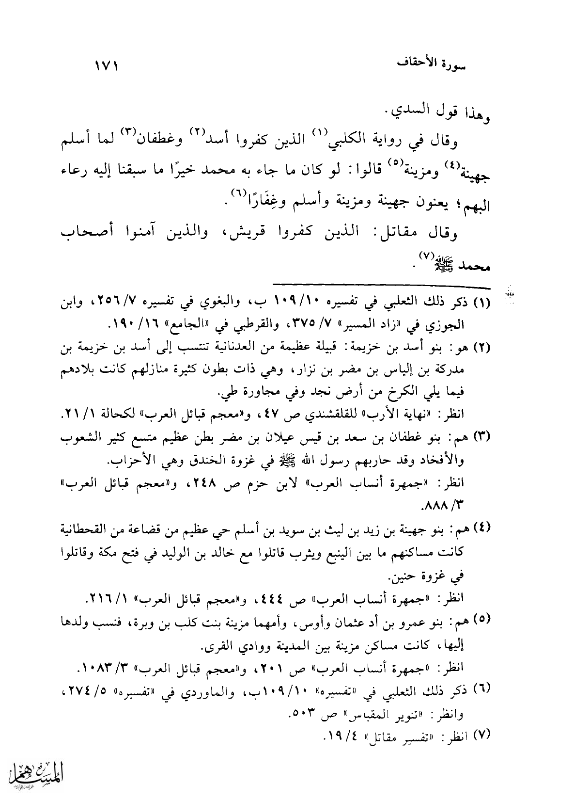 (¬3) هم: بنو غطفان بن سعد بن قيس عيلان بن مضر بطن عظيم متسع كثير الشعوب والأفخاد وقد حاربهم رسول الله -صلى الله عليه وسلم- في غزوة الخندق وهي الأحزاب.