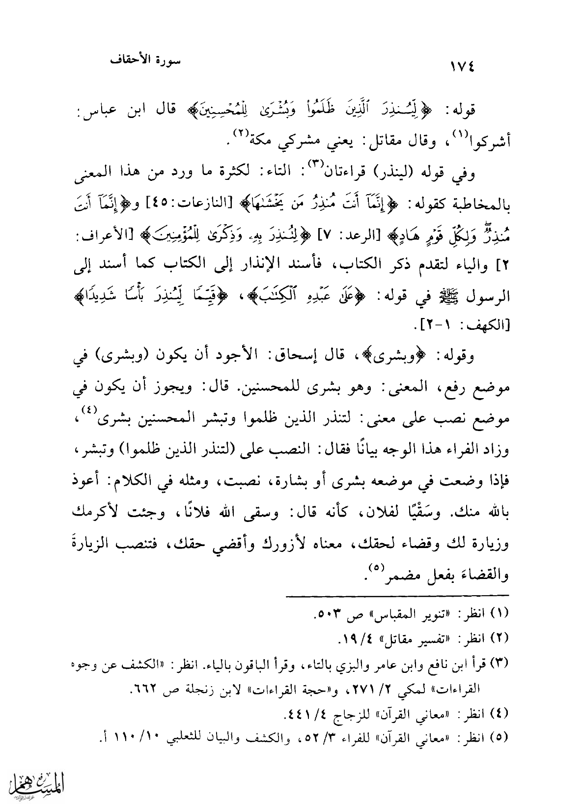 وقوله: {وَبُشْرَى}، قال إسحاق: الأجود أن يكون (وبشرى) في موضع رفع، المعنى: وهو بشرى للمحسنين. قال: ويجوز أن يكون في موضع نصب على معنى: لتنذر الذين ظلموا وتبشر المحسنين بشرى (¬4)، وزاد الفراء هذا الوجه بيانًا فقال: النصب على (لتنذر الذين ظلموا) وتبشر، فإذا وضعت في موضعه بشرى أو بشارة، نصبت، ومثله في الكلام: أعوذ بالله منك. وسَقْيًا لفلان، كأنه قال: وسقى الله فلانًا، وجئت لأكرمك وزيارة لك وقضاء لحقك، معناه لأزورك وأقضي حقك، فتنصب الزيارةَ والقضاءَ بفعل مضمر (¬5).