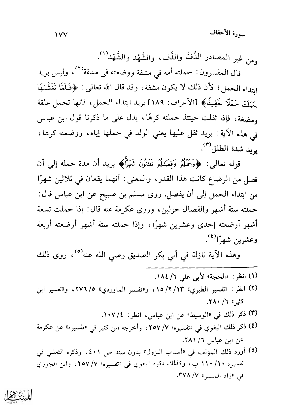 قوله تعالى: {وَحَمْلُهُ وَفِصَالُهُ ثَلَاثُونَ شَهْرًا} يريد أن مدة حمله إلى أن فصل من الرضاع كانت هذا القدر، والمعنى: أنهما يقعان في ثلاثين شهرًا من ابتداء الحمل إلى أن يفصل. روى مسلم بن صبيح عن ابن عباس قال: حملته ستة أشهر والفصال حولين، وروى عكرمة عنه قال: إذا حملت تسعة أشهر أرضعته إحدى وعشرين شهرًا، وإذا حملته ستة أشهر أرضعته أربعة وعشرين شهرًا (¬4).