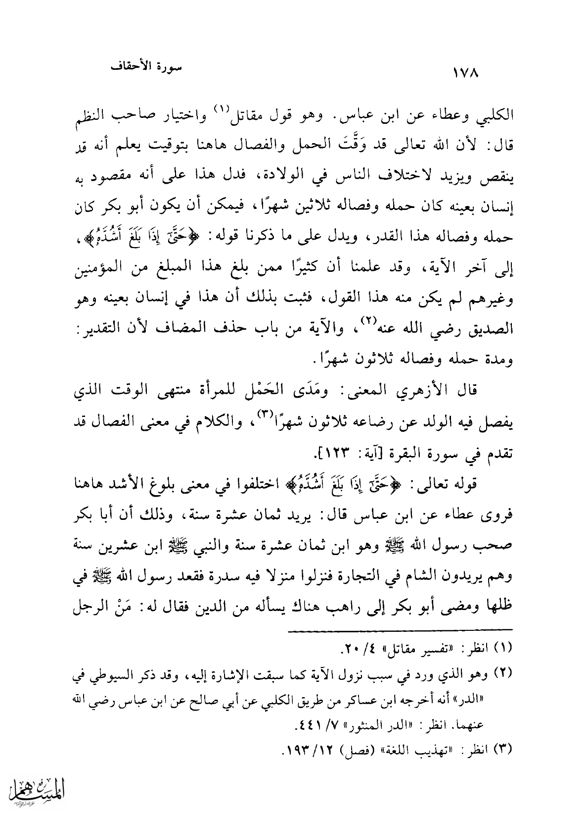 قال الأزهري المعنى: ومَدَى الحَمْل للمرأة منتهى الوقت الذي يفصل فيه الولد عن رضاعه ثلاثون شهرًا (¬3)، والكلام في معنى الفصال قد تقدم في سورة البقرة [آية: 123].