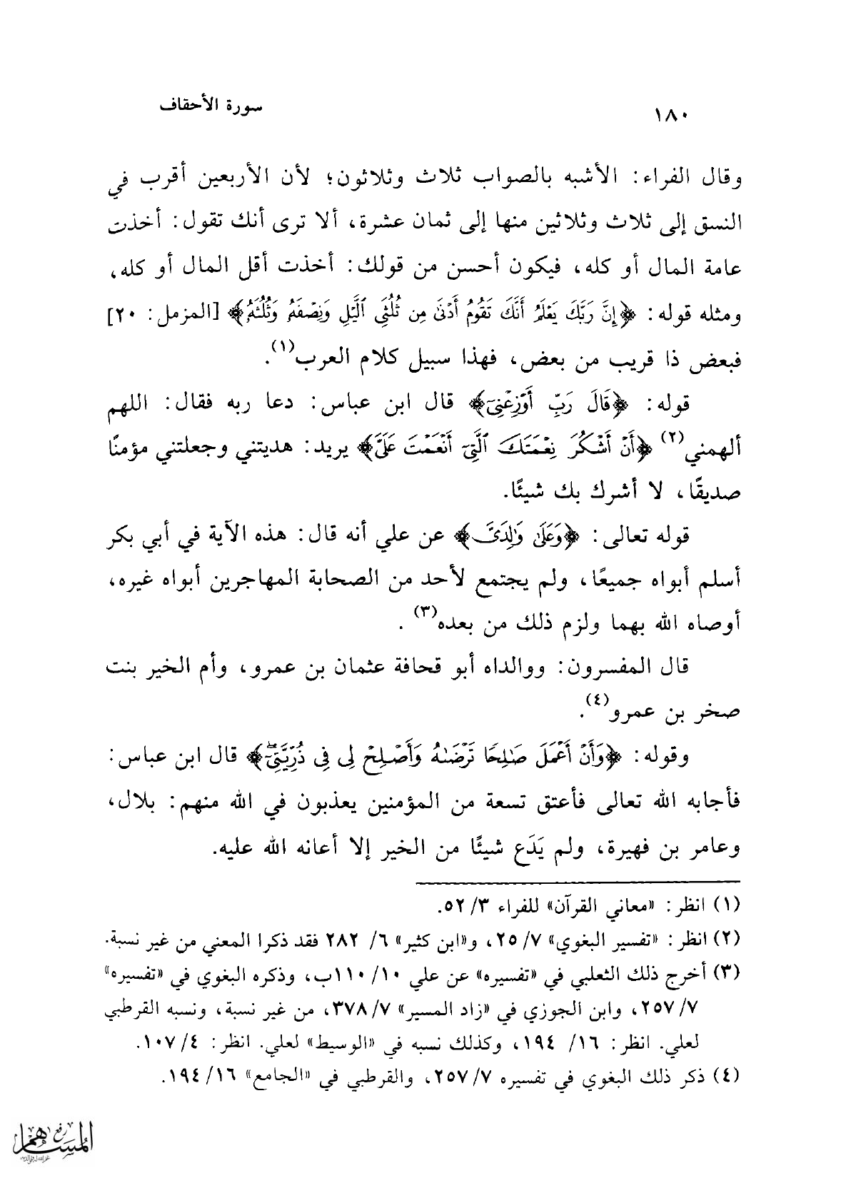 وقال الفراء: الأشبه بالصواب ثلاث وثلاثون؛ لأن الأربعين أقرب في النسق إلى ثلاث وثلاثين منها إلى ثمان عشرة، ألا ترى أنك تقول: أخذت عامة المال أو كله، فيكون أحسن من قولك: أخذت أقل المال أو كله، ومثله قوله: {إِنَّ رَبَّكَ يَعْلَمُ أَنَّكَ تَقُومُ أَدْنَى مِنْ ثُلُثَيِ اللَّيْلِ وَنِصْفَهُ وَثُلُثَهُ} [المزمل: 20] فبعض ذا قريب من بعض، فهذا سبيل كلام العرب (¬1).
