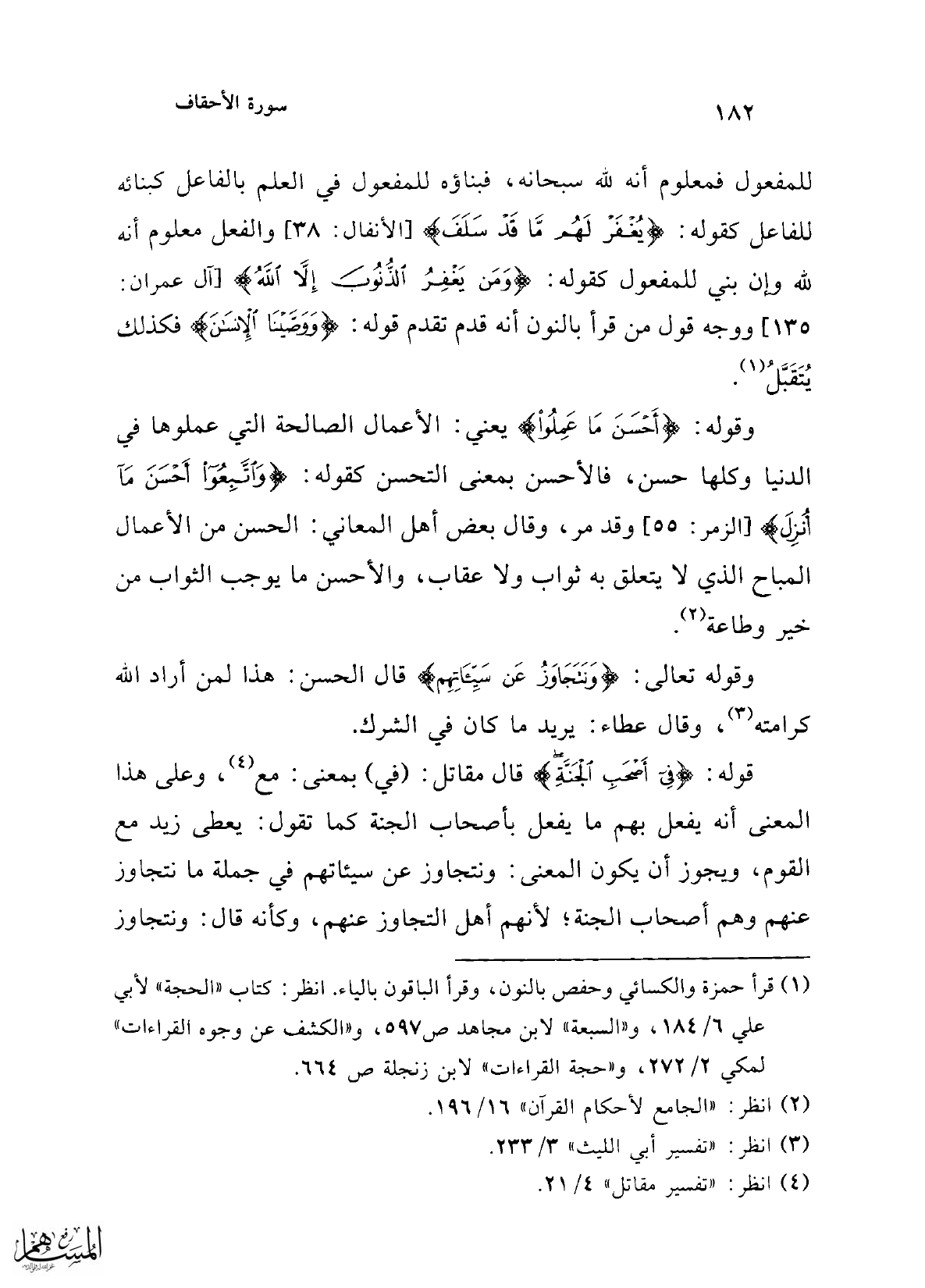للمفعول فمعلوم أنه لله سبحانه، فبناؤه للمفعول في العلم بالفاعل كبنائه للفاعل كقوله: {يُغْفَرْ لَهُمْ مَا قَدْ سَلَفَ} [الأنفال: 38] والفعل معلوم أنه لله وإن بني للمفعول كقوله: {وَمَنْ يَغْفِرُ الذُّنُوبَ إِلَّا اللَّهُ} [آل عمران: 135] ووجه قول من قرأ بالنون أنه قدم تقدم قوله: {وَوَصَّيْنَا الْإِنْسَانَ} فكذلك يُتَقَبَّلُ (¬1).