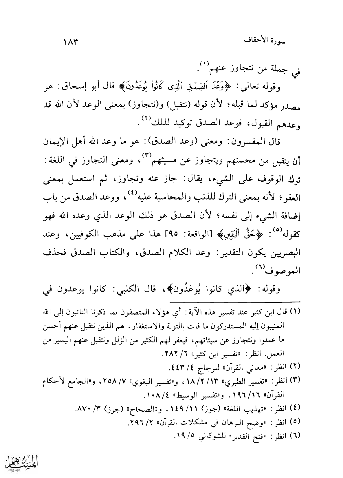 قال المفسرون: ومعنى (وعد الصدق): هو ما وعد الله أهل الإيمان أن يتقبل من محسنهم ويتجاوز عن مسيئهم (¬3)، ومعنى التجاوز في اللغة: ترك الوقوف على الشيء، يقال: جاز عنه وتجاوز، ثم استعمل بمعنى العفو؛ لأنه بمعنى الترك للذنب والمحاسبة عليه (¬4)، ووعد الصدق من باب إضافة الشيء إلى نفسه؛ لأن الصدق هو ذلك الوعد الذي وعده الله فهو كقوله (¬5): {حَقُّ الْيَقِينِ} [الواقعة: 95] هذا على مذهب الكوفيين، وعند البصريين يكون التقدير: وعد الكلام الصدق، والكتاب الصدق فحذف الموصوف (¬6).